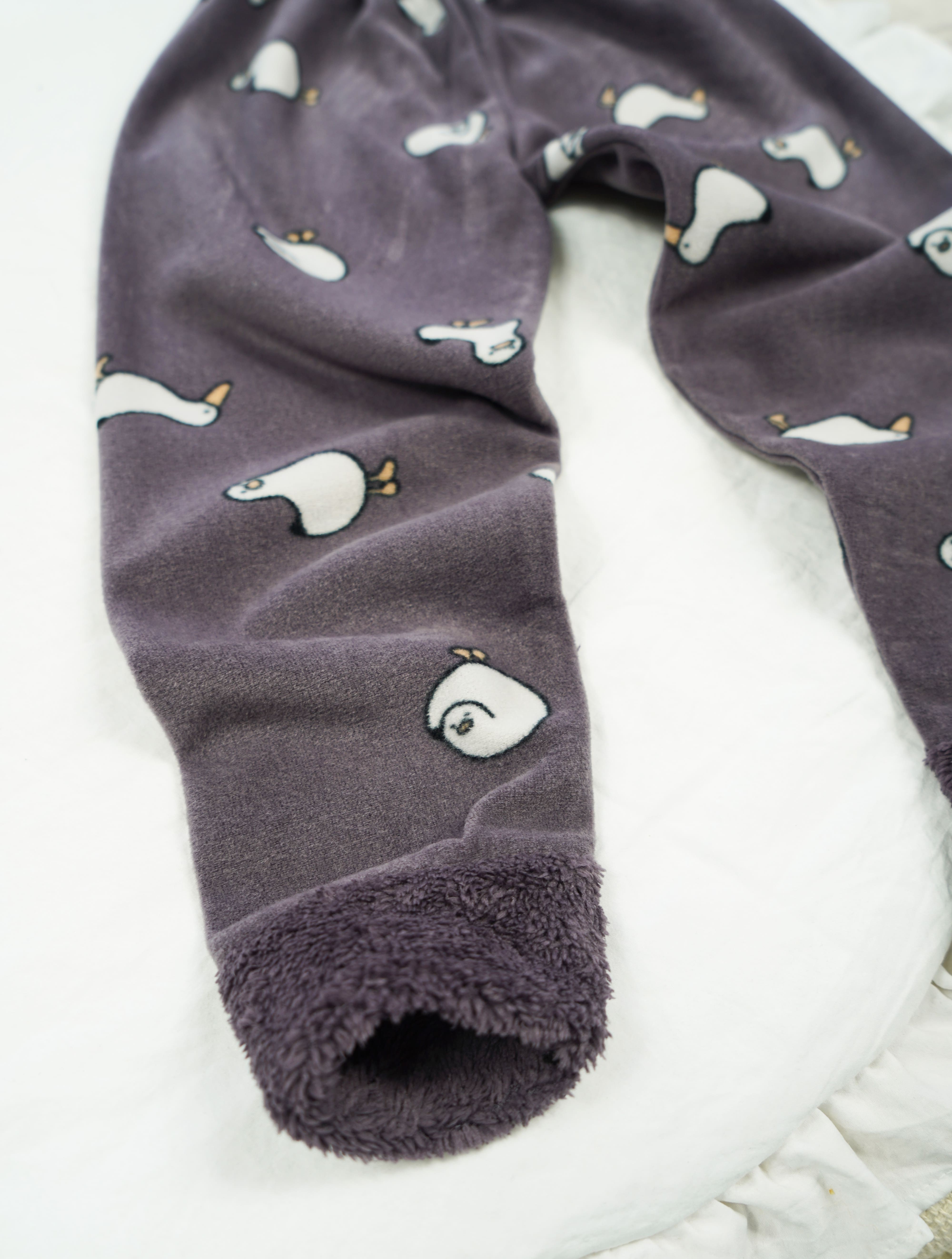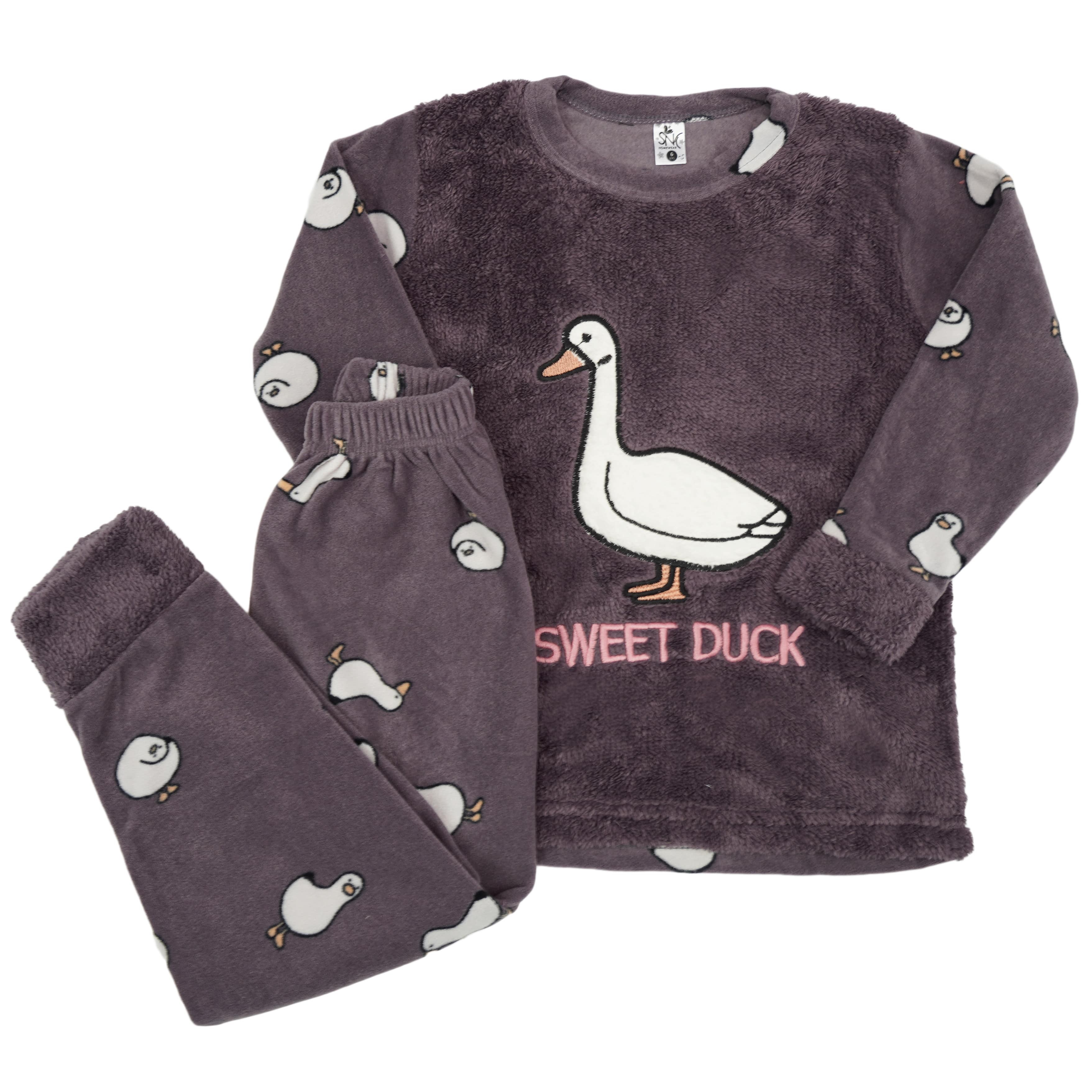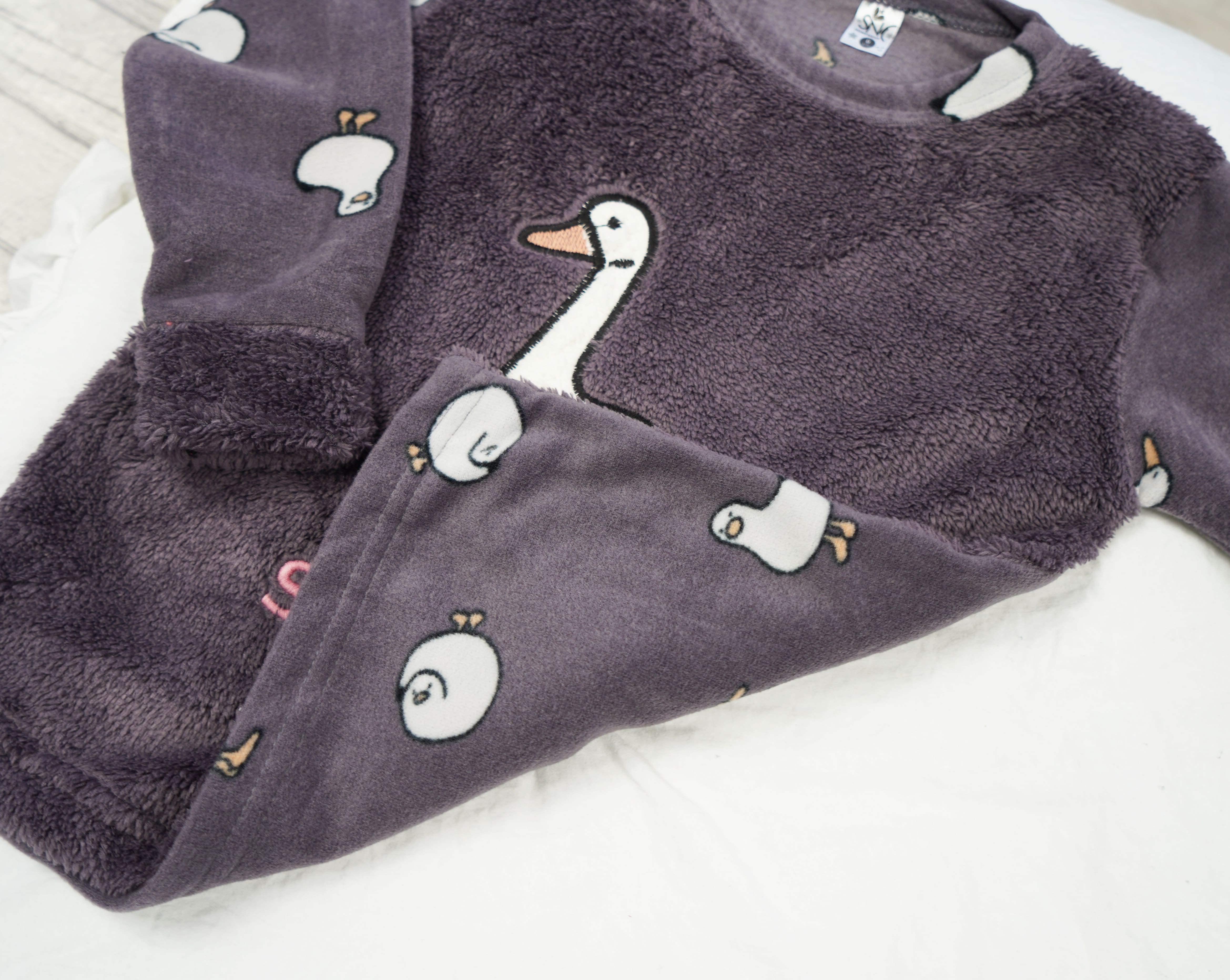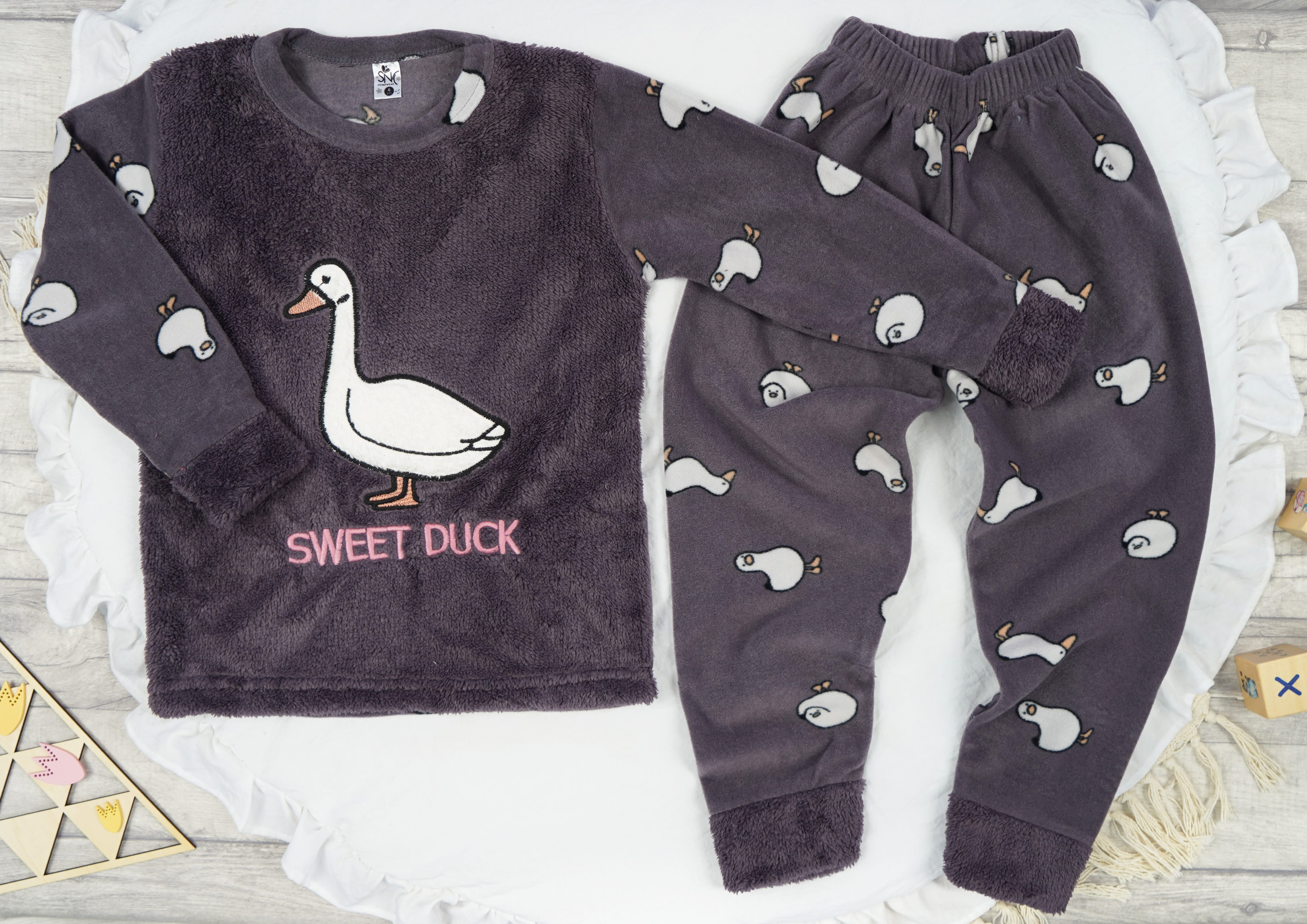 Polarowo- pluszowa piżama dziecięca o wygodnym kroju, składająca się z długich spodni i bluzeczki z długim rękawem. Bluza uszyta z miękkiego polaru z motywem kaczki z pluszowym wykończeniem. Spodenki posiadają gumkę w pasie, która sprawia, że dobrze utrzymują się na sylwetce, nie uciskając ciała. Proste nogawki spodni, wykończone pluszowym mankietem.