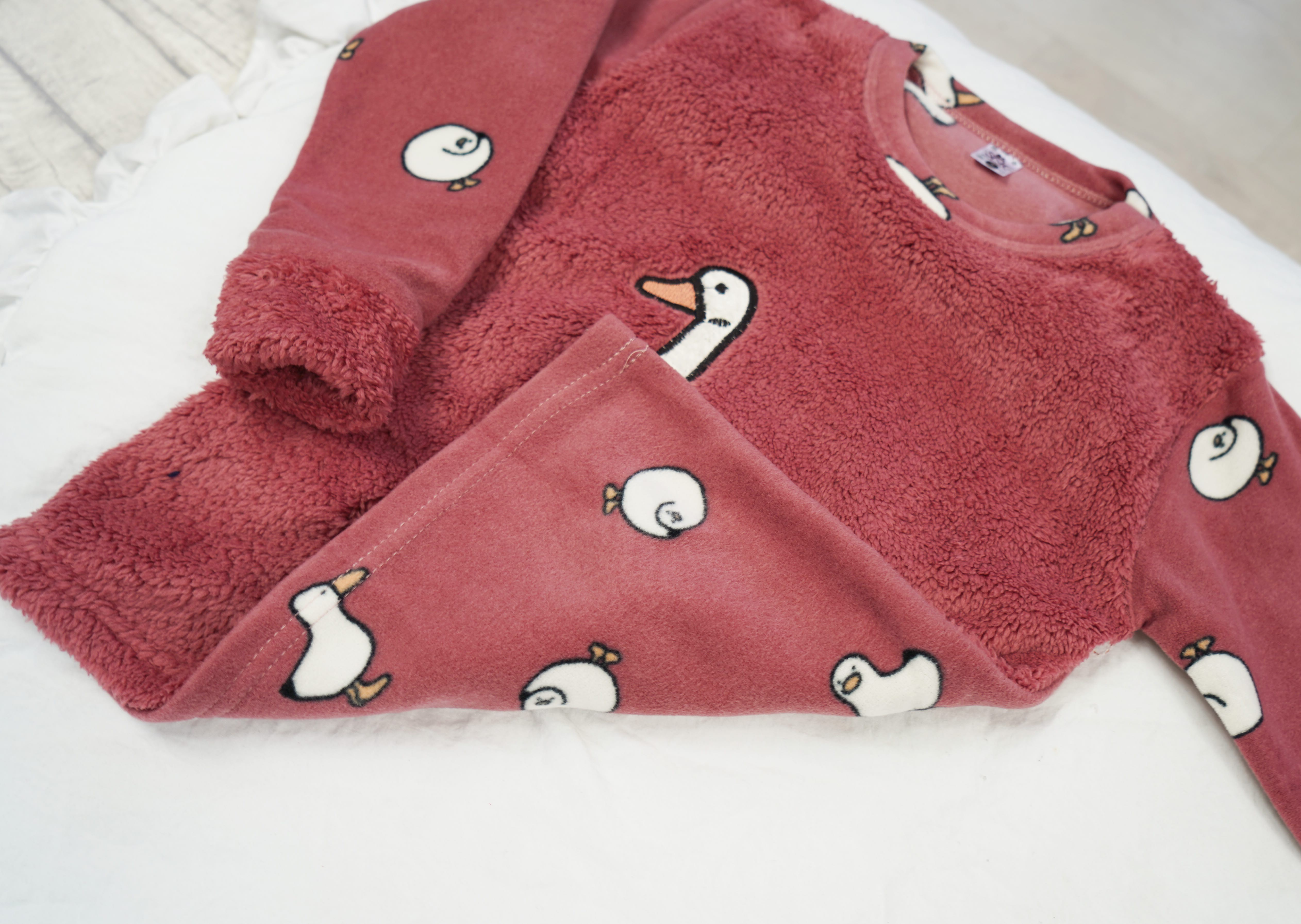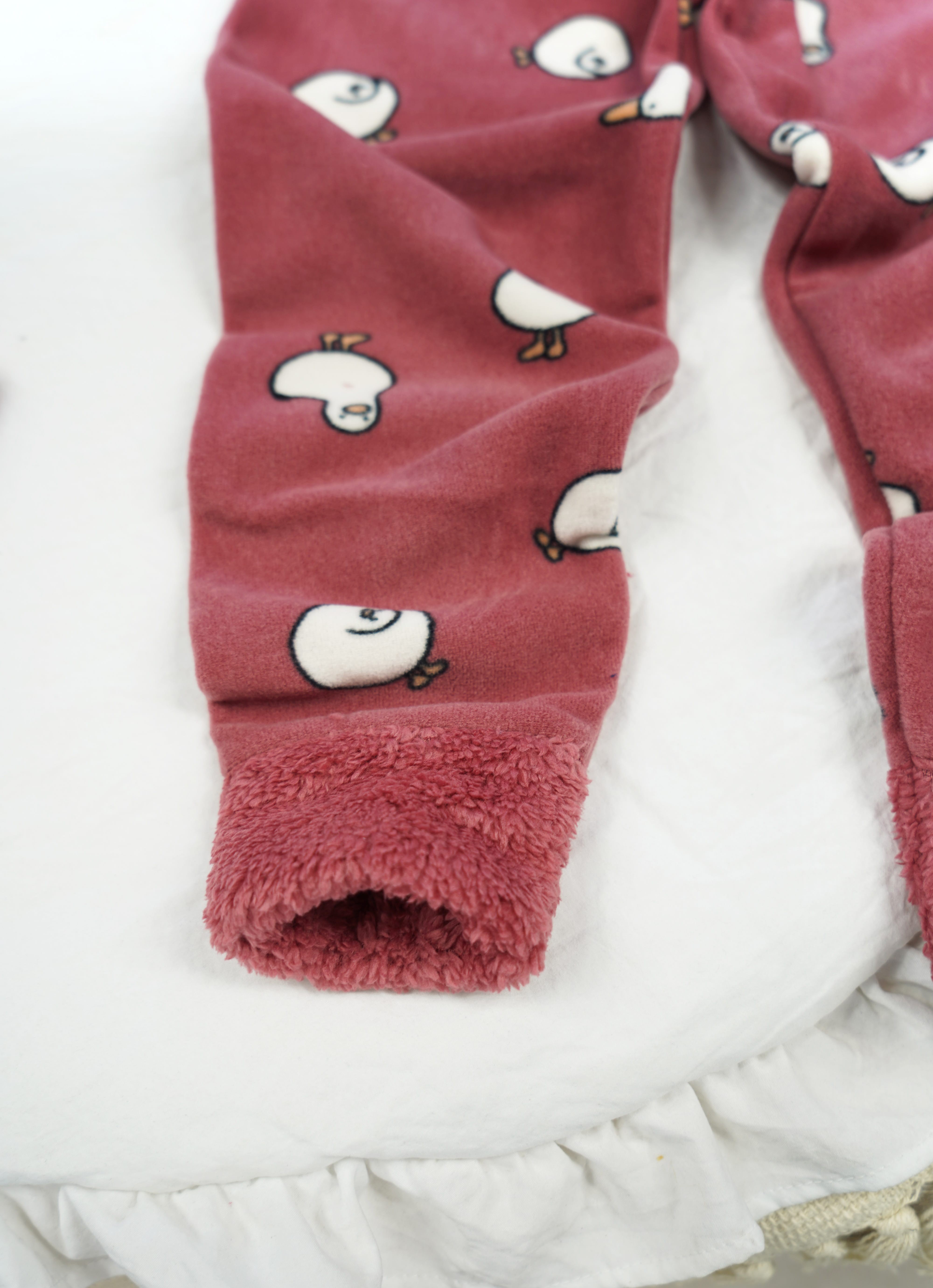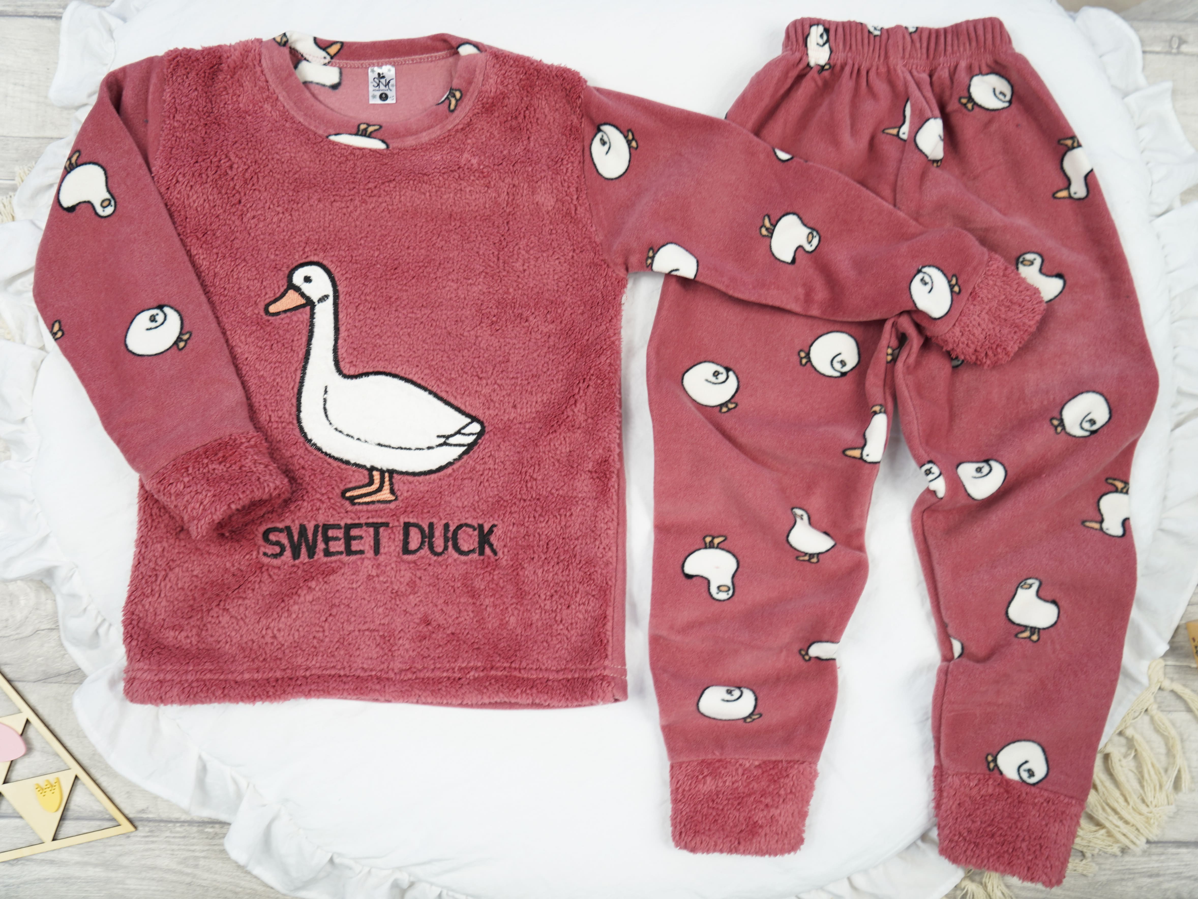 Polarowo- pluszowa piżama dziecięca o wygodnym kroju, składająca się z długich spodni i bluzeczki z długim rękawem. Bluza uszyta z miękkiego polaru z motywem kaczki z pluszowym wykończeniem. Spodenki posiadają gumkę w pasie, która sprawia, że dobrze utrzymują się na sylwetce, nie uciskając ciała. Proste nogawki spodni, wykończone pluszowym mankietem.