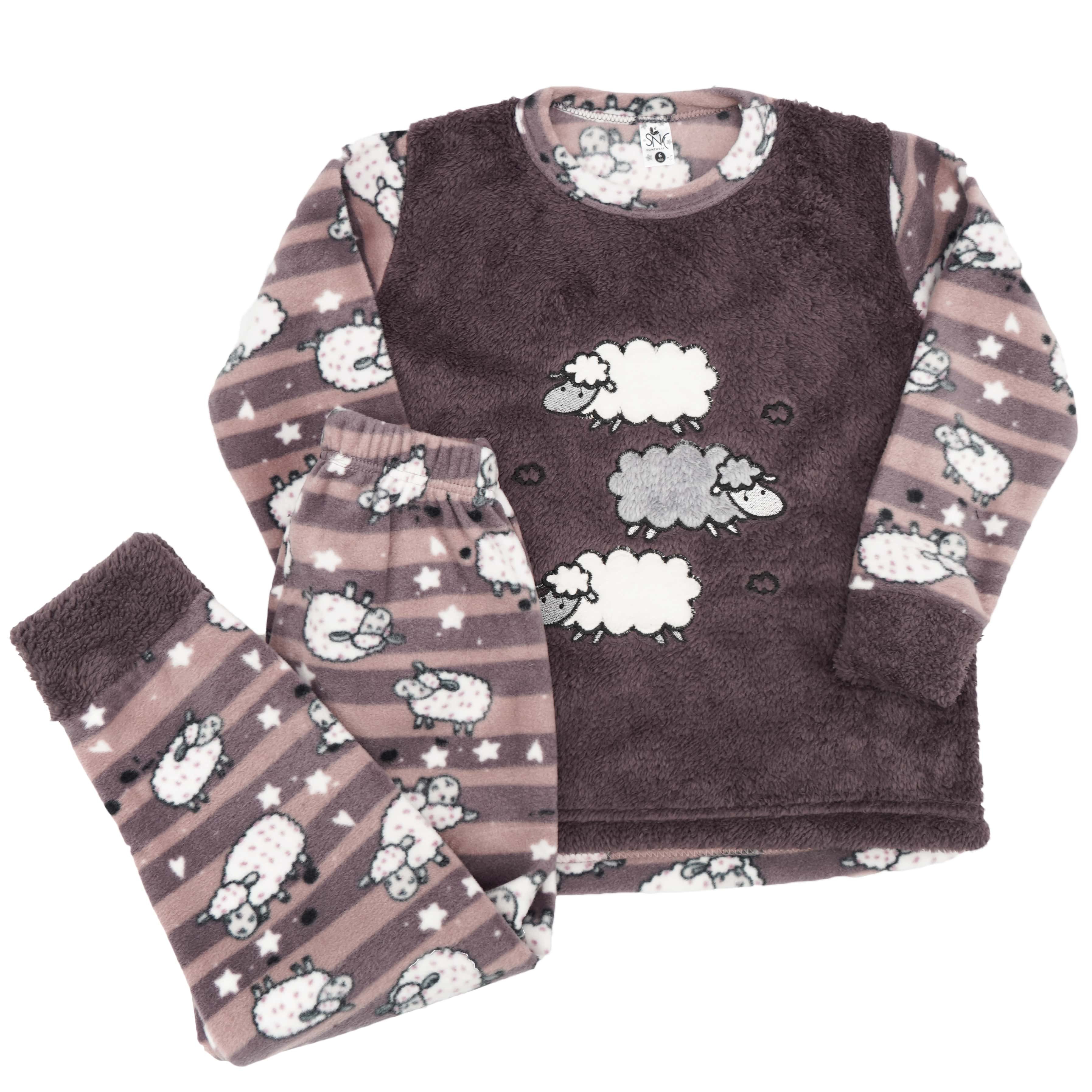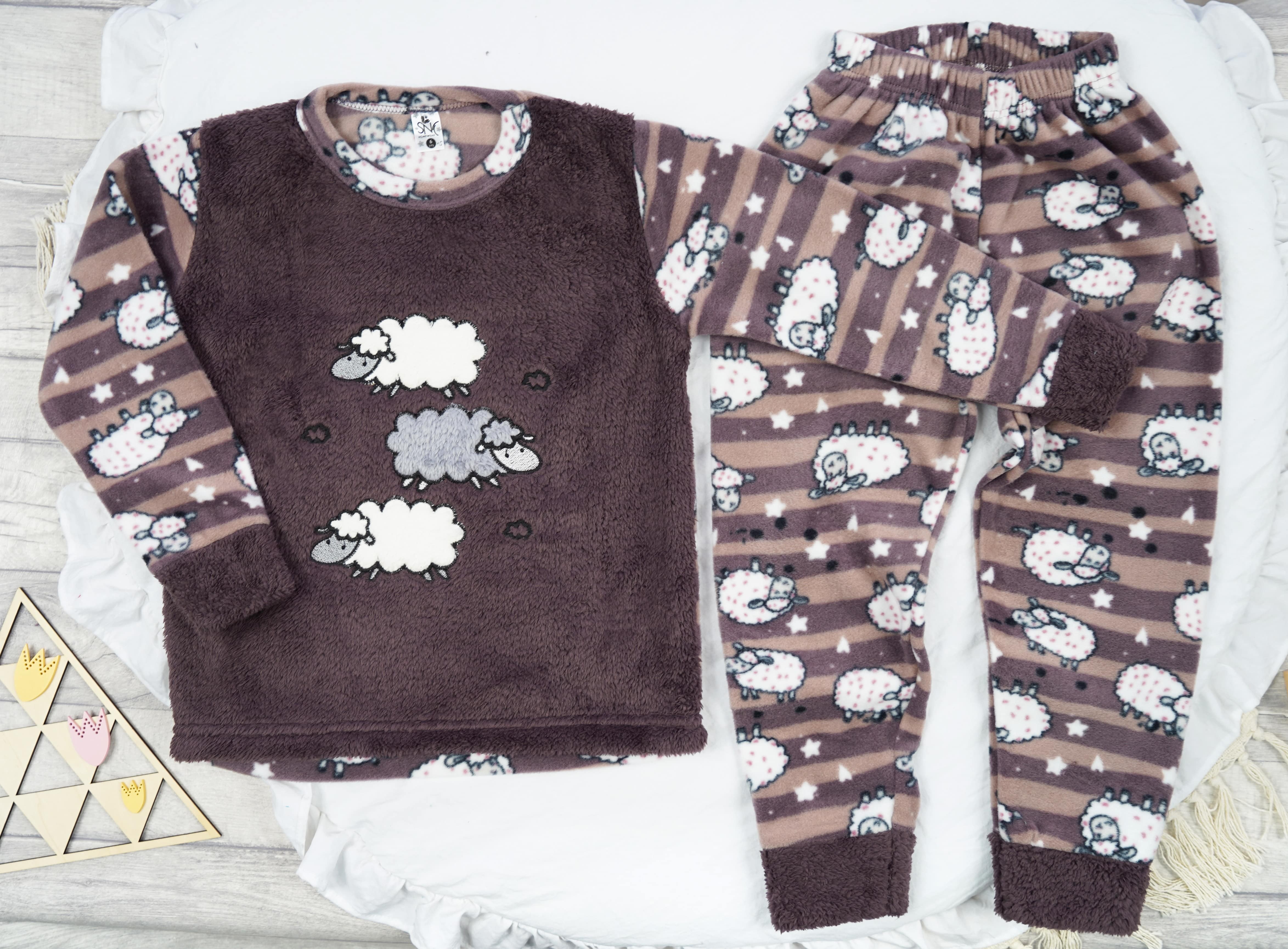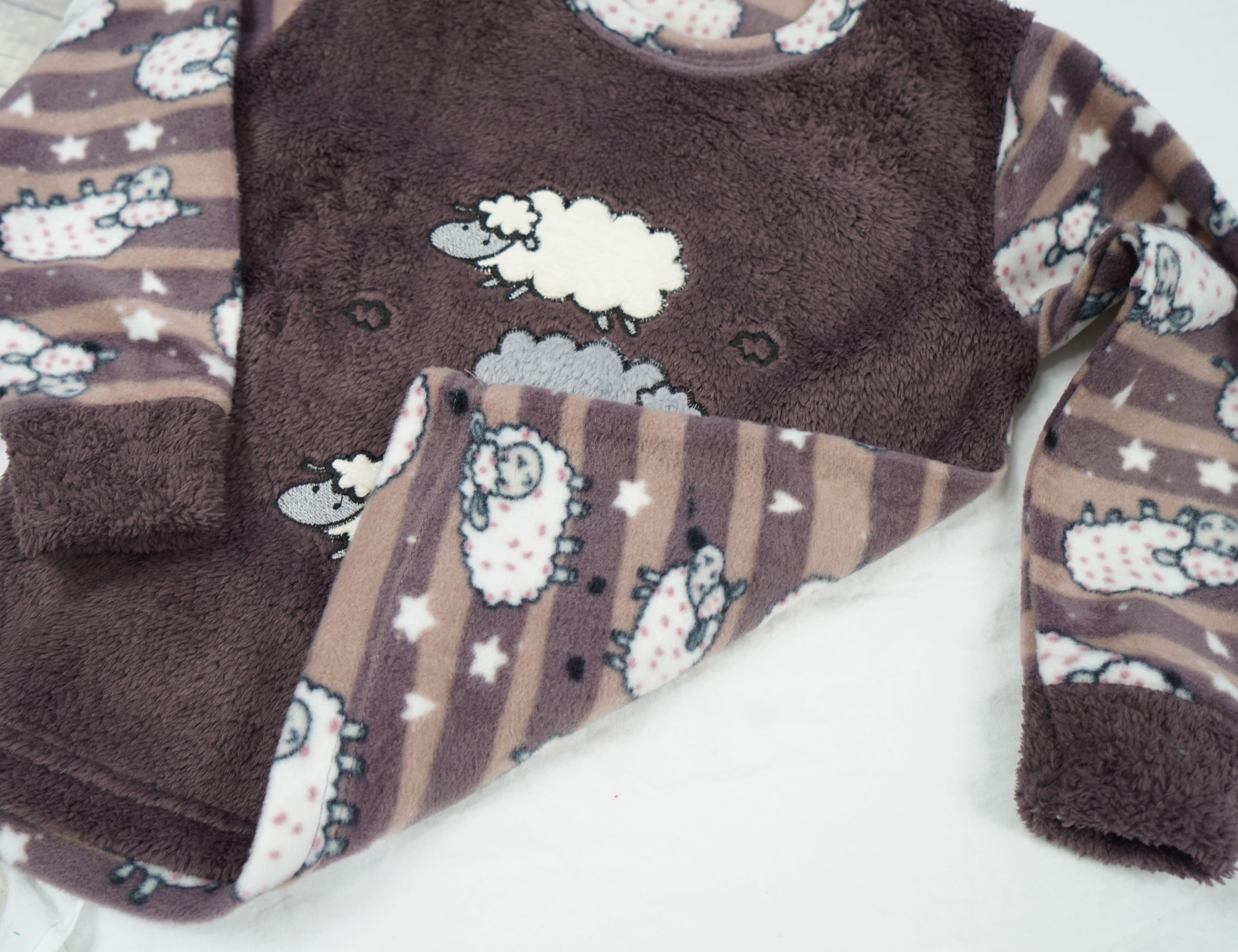 Polarowo- pluszowa piżama dziecięca o wygodnym kroju, składająca się z długich spodni i bluzeczki z długim rękawem. Bluza uszyta z miękkiego polaru z motywem owieczek z pluszowym wykończeniem. Spodenki posiadają gumkę w pasie, która sprawia, że dobrze utrzymują się na sylwetce, nie uciskając ciała. Proste nogawki spodni, wykończone pluszowym mankietem.