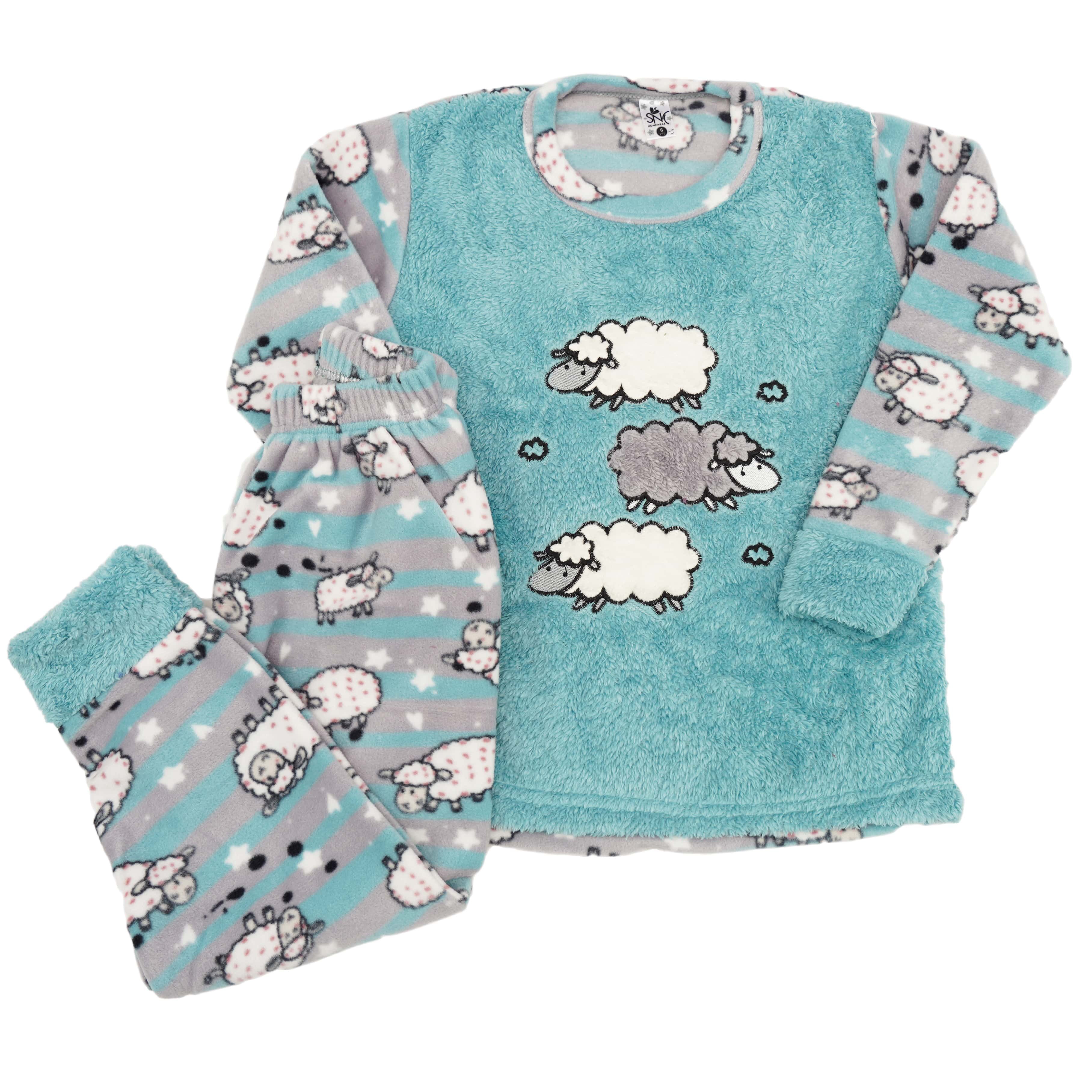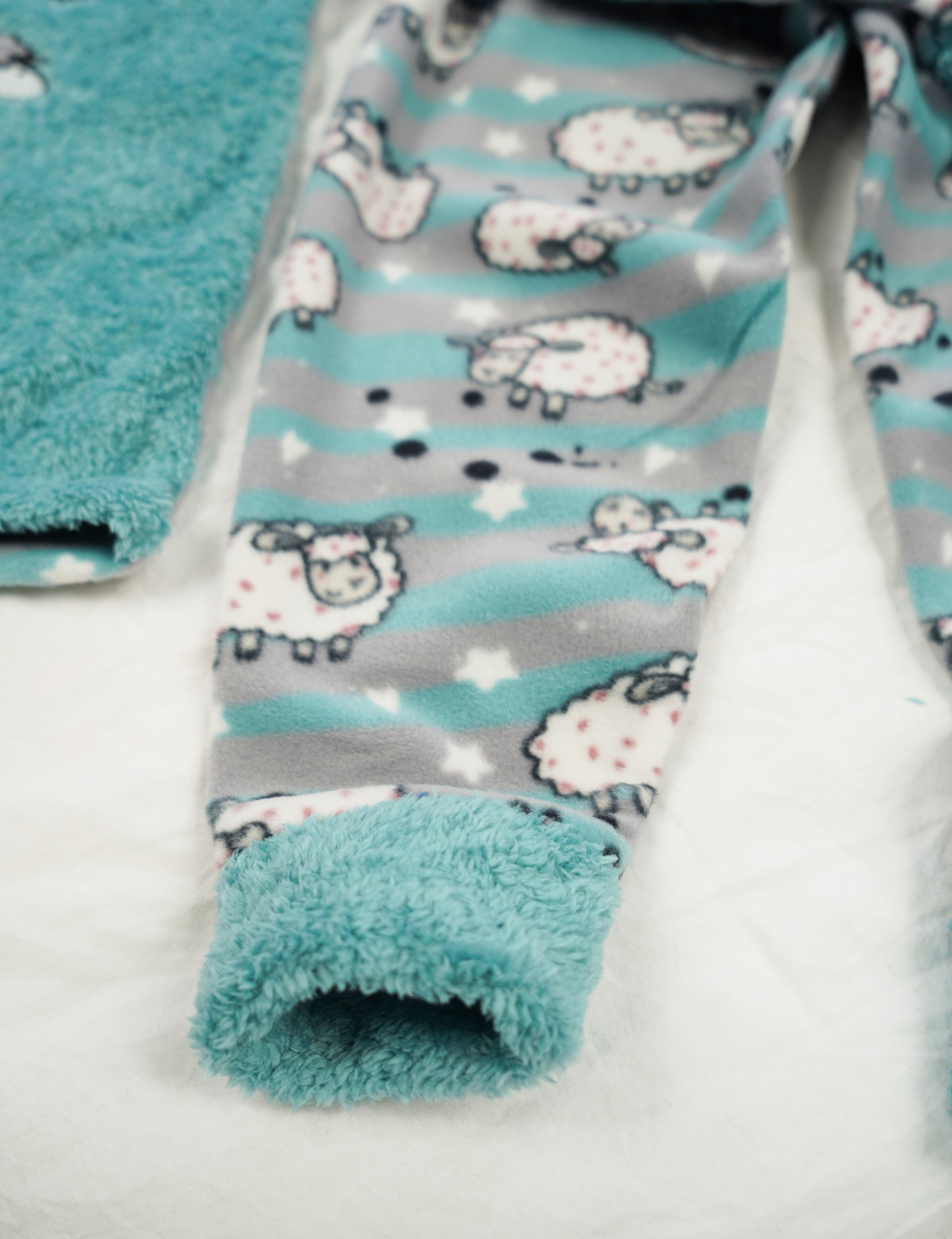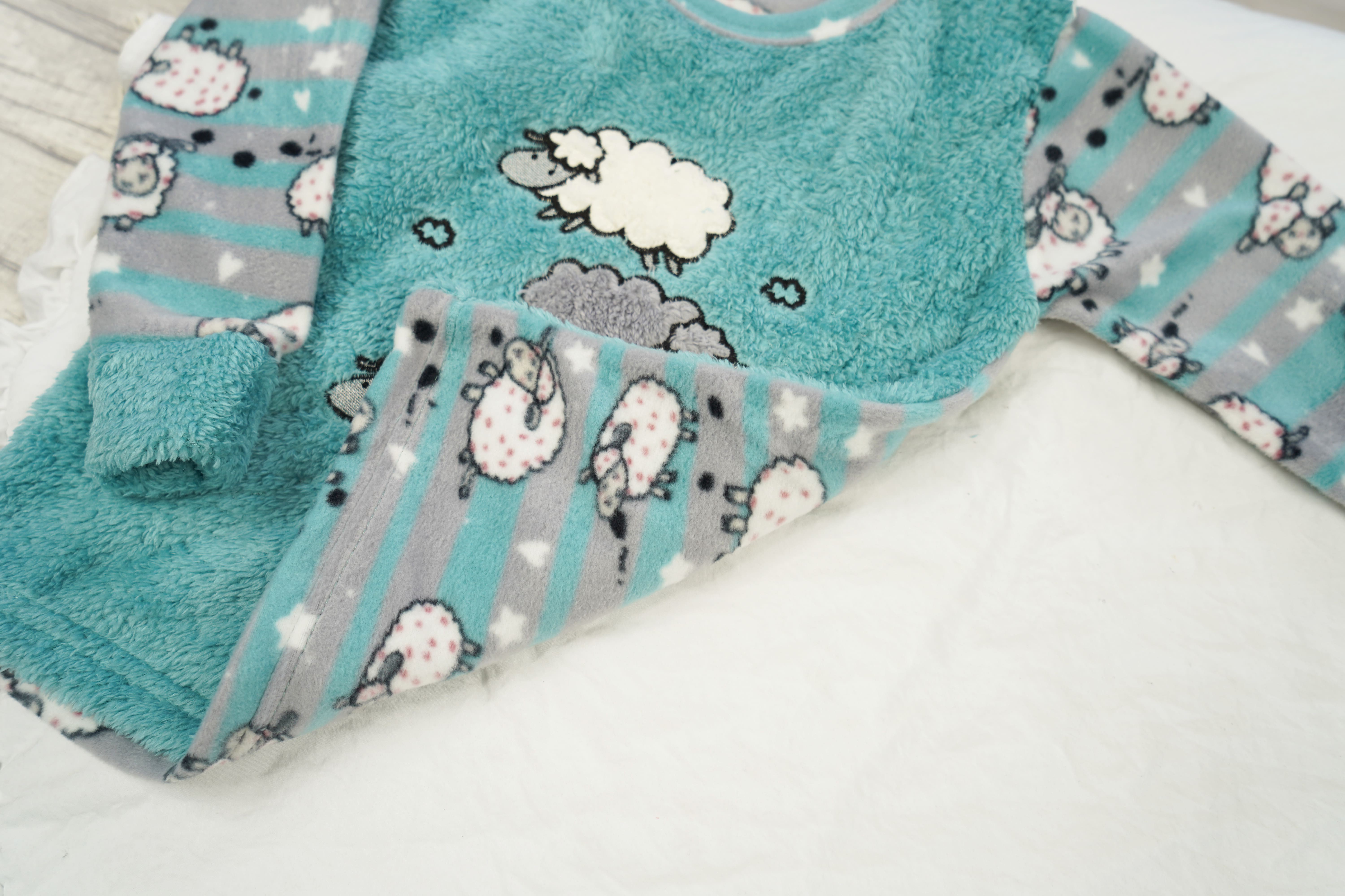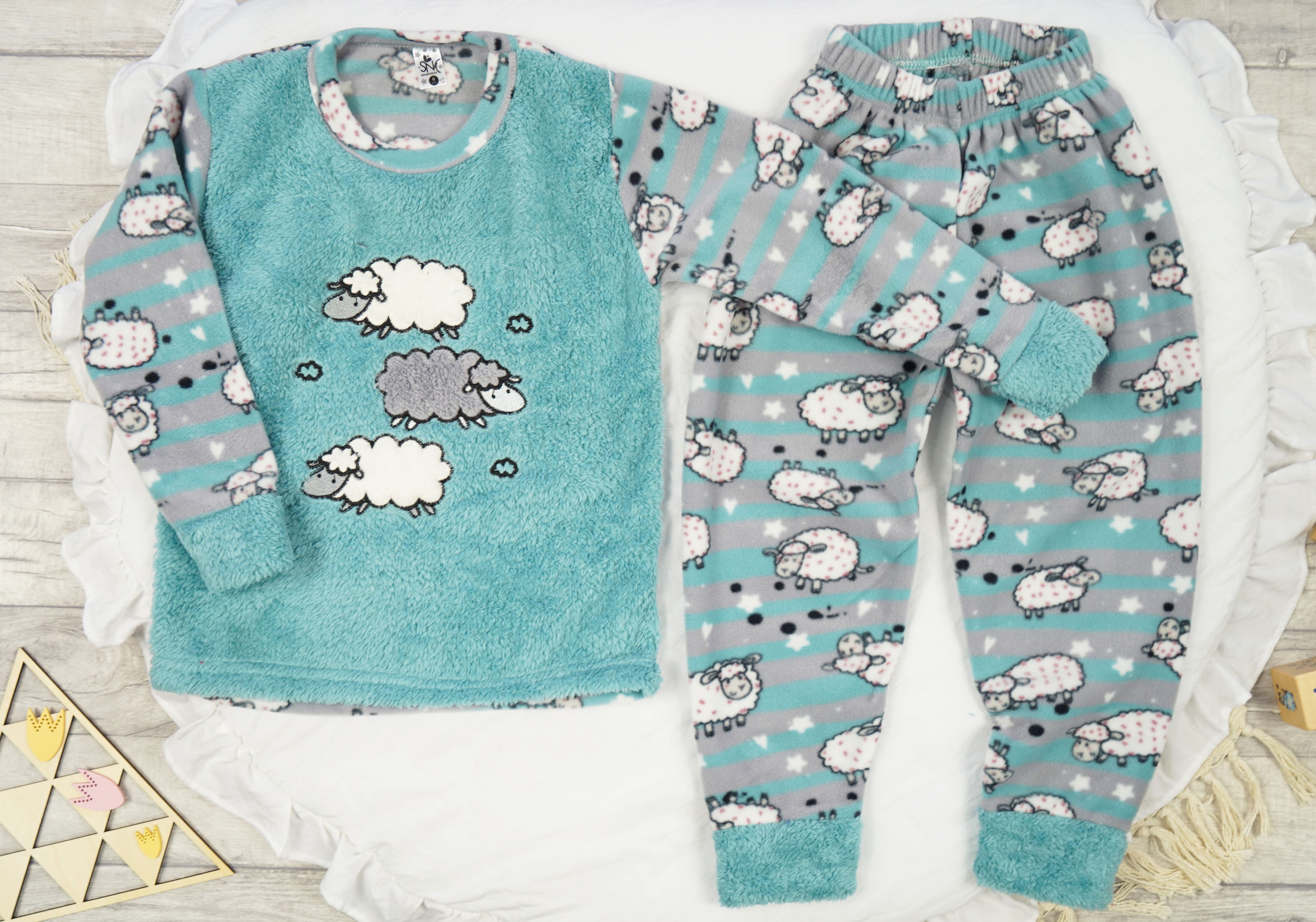 Polarowo- pluszowa piżama dziecięca o wygodnym kroju, składająca się z długich spodni i bluzeczki z długim rękawem. Bluza uszyta z miękkiego polaru z motywem owieczek z pluszowym wykończeniem. Spodenki posiadają gumkę w pasie, która sprawia, że dobrze utrzymują się na sylwetce, nie uciskając ciała. Proste nogawki spodni, wykończone pluszowym mankietem.