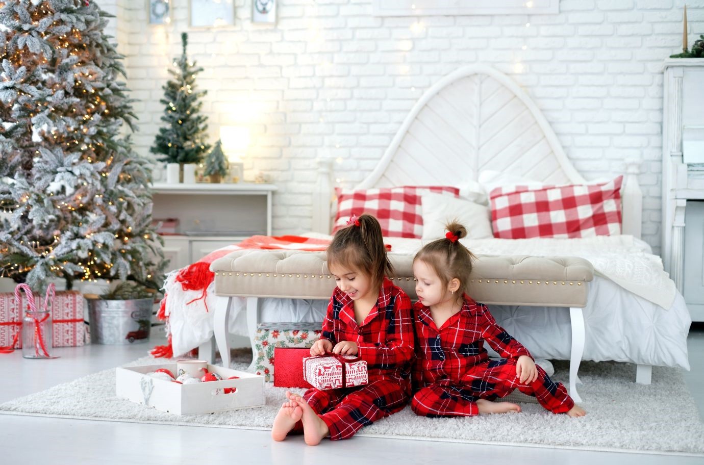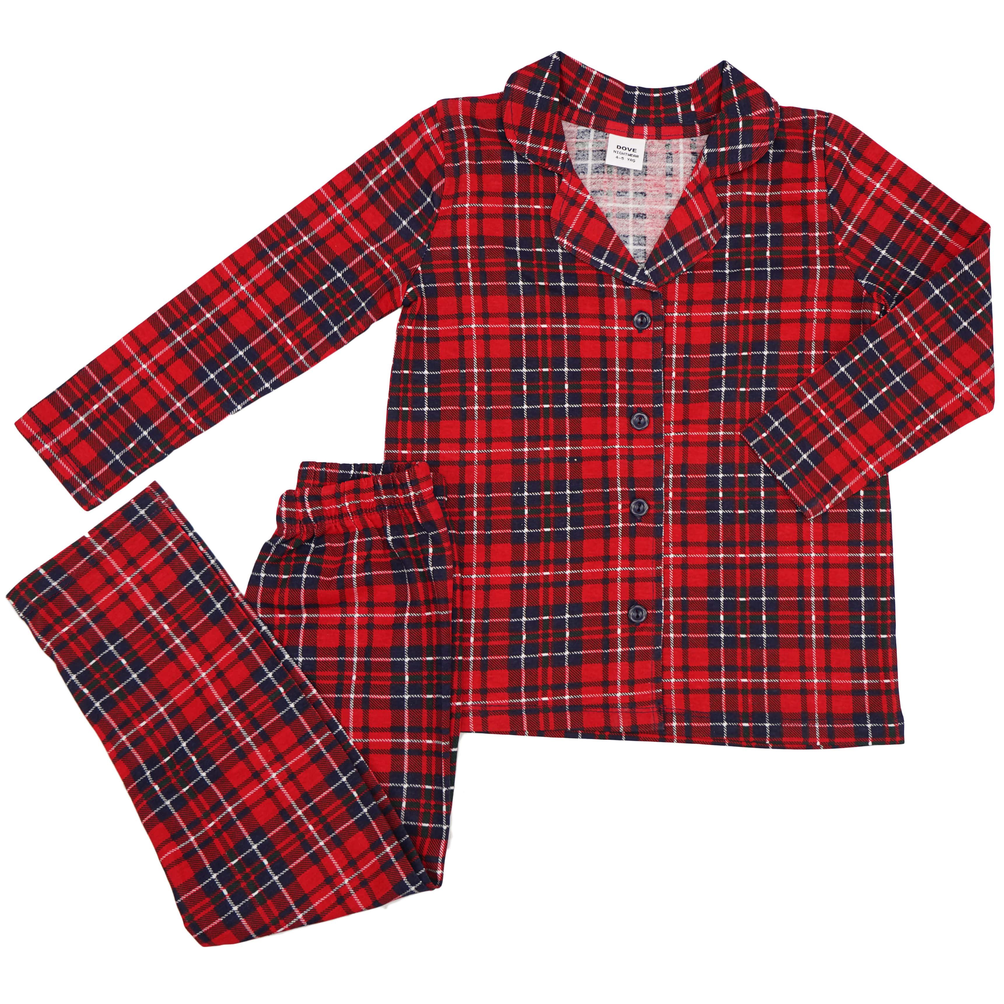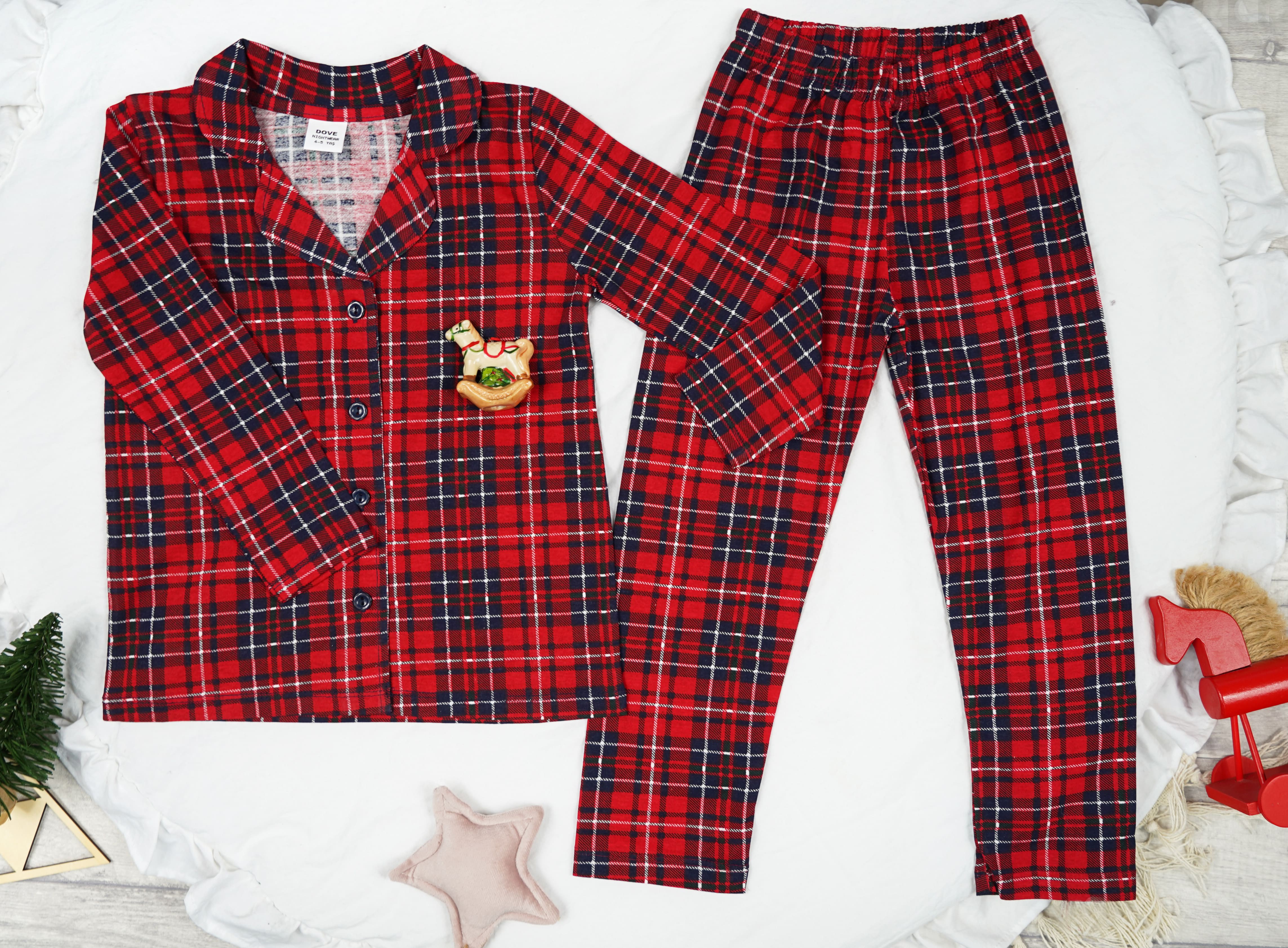 Dwuczęściowa piżama dla dziewczynki lub chłopca o wygodnym kroju, składająca się z długich spodni i koszuli z długim rękawem. Piżama świąteczna w kratkę składa się z koszuli z kołnierzykiem rozpinanej na całej długości, uszytej z przyjemnego w dotyku materiału w kratę, a także spodenek posiadających gumkę w pasie, która sprawia, że dobrze utrzymują się na sylwetce, nie uciskając ciała. Proste nogawki spodni, bez ściągacza.