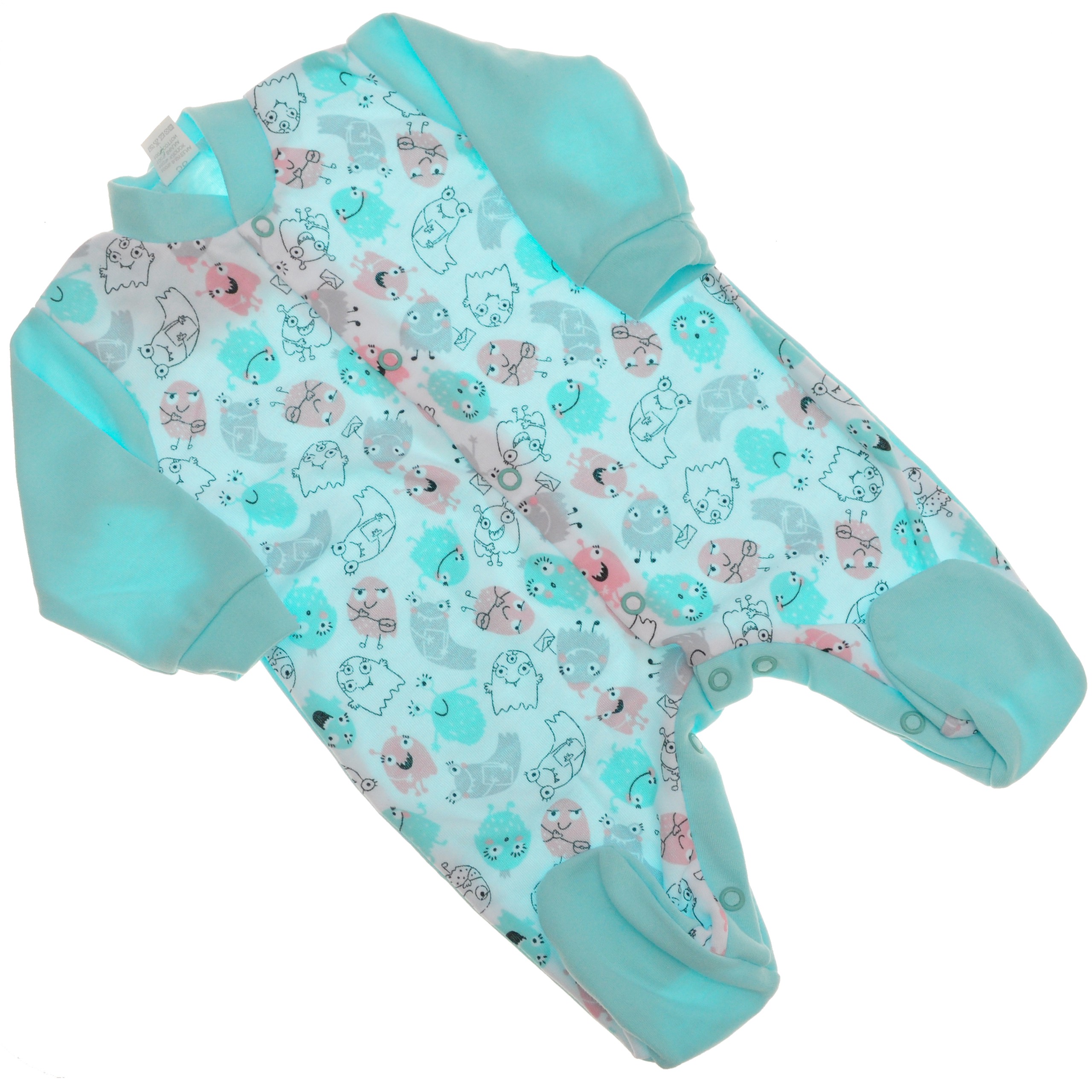 Pajac bawełniany niemowlęcy w kolorze miętowym z nadrukiem w zabawne stworki na białym tle.