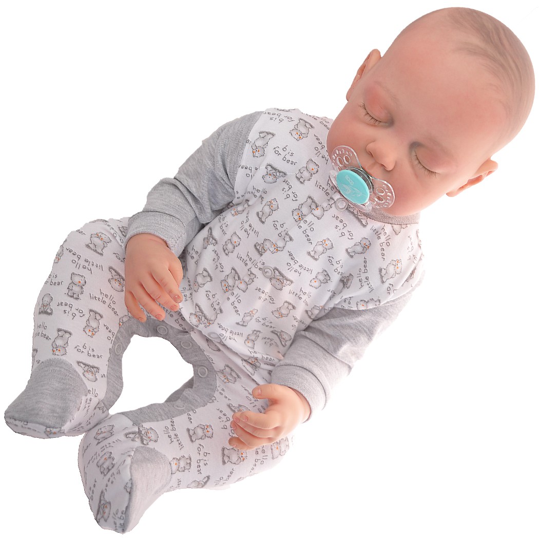 Pajac bawełniany niemowlęcy w biało-szarej kolorystyce z misiami, wykończony szarą lamówką.