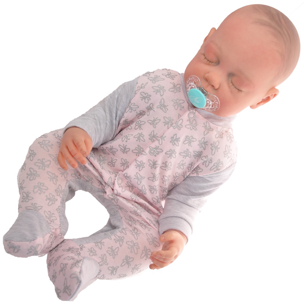 Pajac bawełniany niemowlęcy, -szaro-różowy w srebrne, brokatowe motylki, wykończony szarą lamówką.