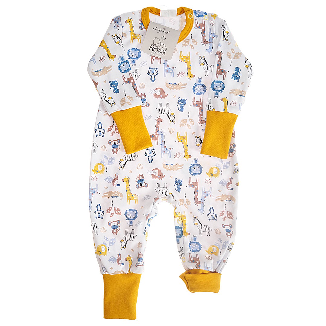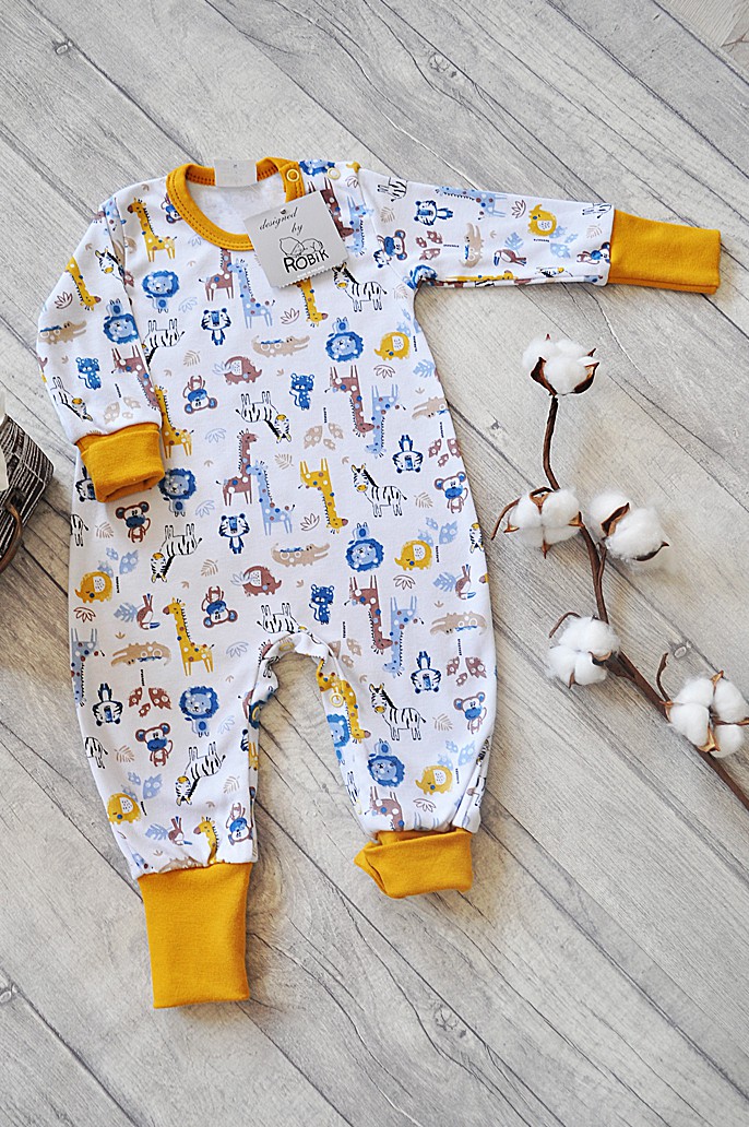 Bawełniany pajacyk bez stópek zapewniający komfort oraz wygodę ruchów malucha. Zapinany na napki na ramieniu oraz w kroku tak, aby łatwo można było ubrać i przewinąć maluszka. Uszyty z 100% bawełny w kolorze białym drukowanej w zwierzątka ZOO, wykończonej musztardowymi mankietami przy rękawach i nogawkach oraz lamówką przy dekolcie.