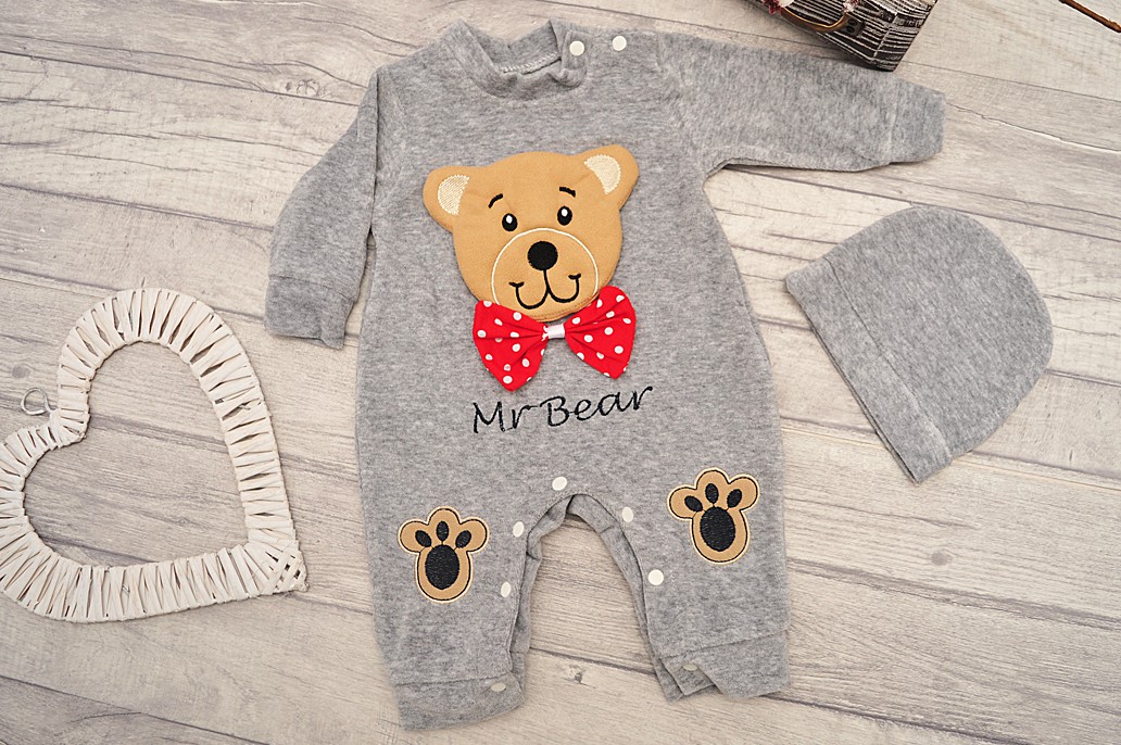 Komplet niemowlęcy w skład którego wchodzą szary pajacyk welurowy bez stópek oraz welurowa czapeczka typu smerfetka. Pajac dla niemowlaka zapinany na ramieniu oraz w kroku na bezniklowe napki. Wyjątkowego uroku dodaje temu niemowlęcemu pajacykowi duża, miła, trójwymiarowa aplikacja beżowego misia z czerwoną kokardą w grochy umiejscowiona z przodu pajacyka oraz aplikacje misiowych stópek na nogawkach pajacyka.