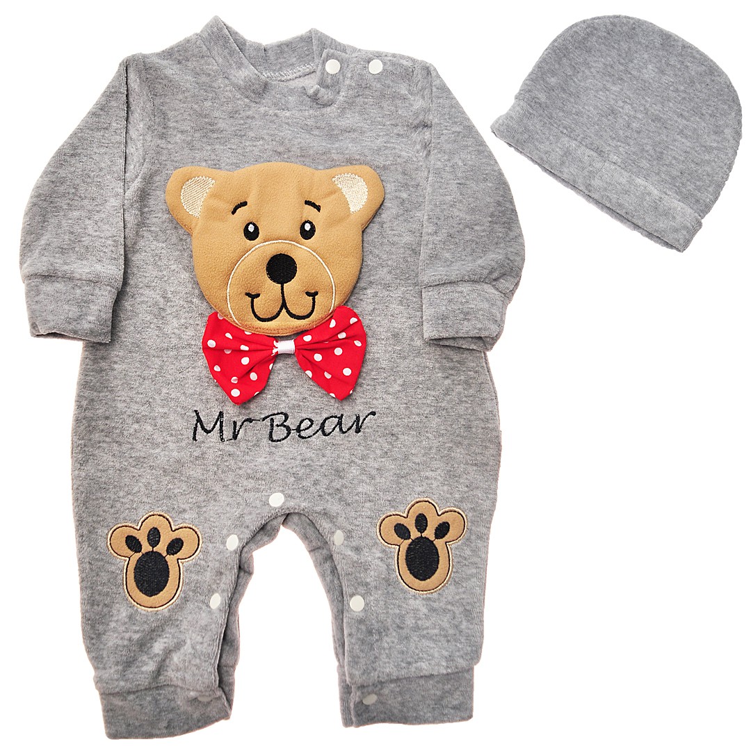 Oryginalny i ciepły pajac welurowy dla niemowlaka sprawdzi się idealnie w chłodne dni a dołączona do kompletu czapeczka zapewni dodatkowa ochronę główki maluszka.