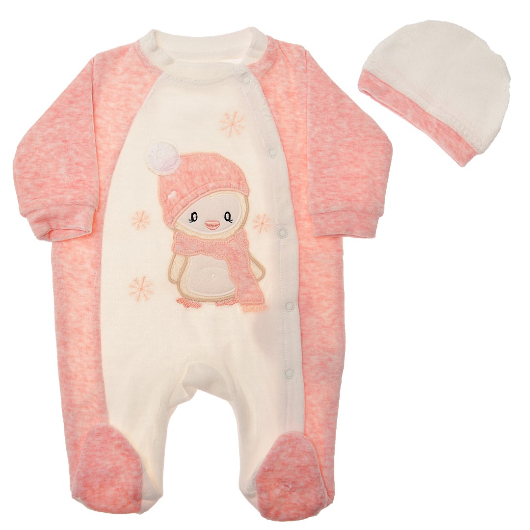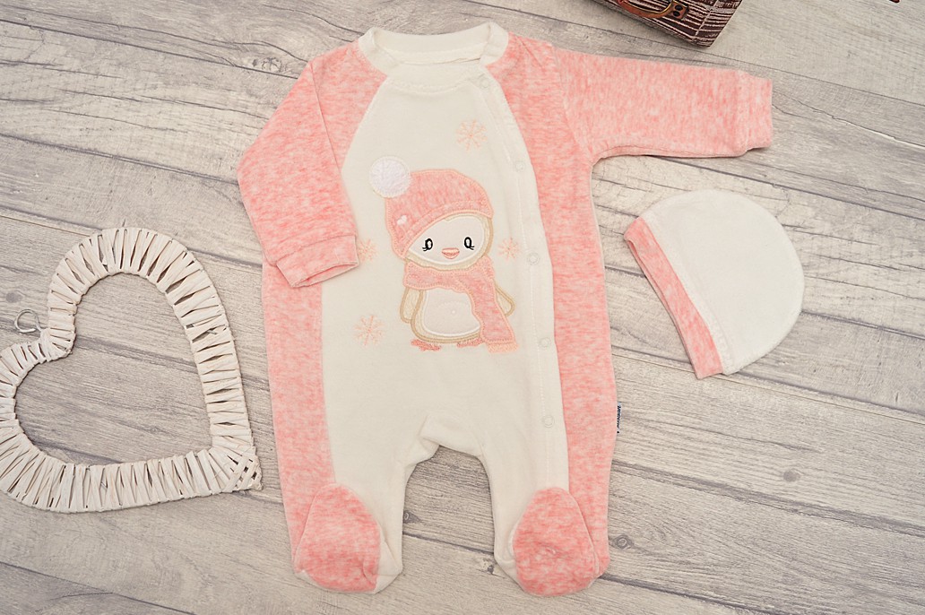 Komplet niemowlęcy w skład którego wchodzą różowo-ecru pajacyk welurowy ze stópkami oraz welurowa czapeczka typu smerfetka. Pajac dla niemowlaka zapinany po boku przez całą długość na bezniklowe napki. Wyjątkowego uroku dodaje temu niemowlęcemu pajacykowi miła, trójwymiarowa aplikacja pingwinka z przodu pajacyka.