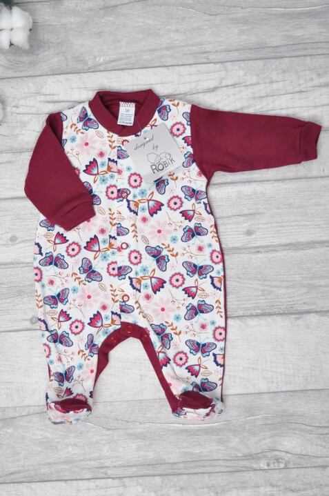 Pajac bawełniany niemowlęcy w bordowej kolorystyce z nadrukiem w motylki.