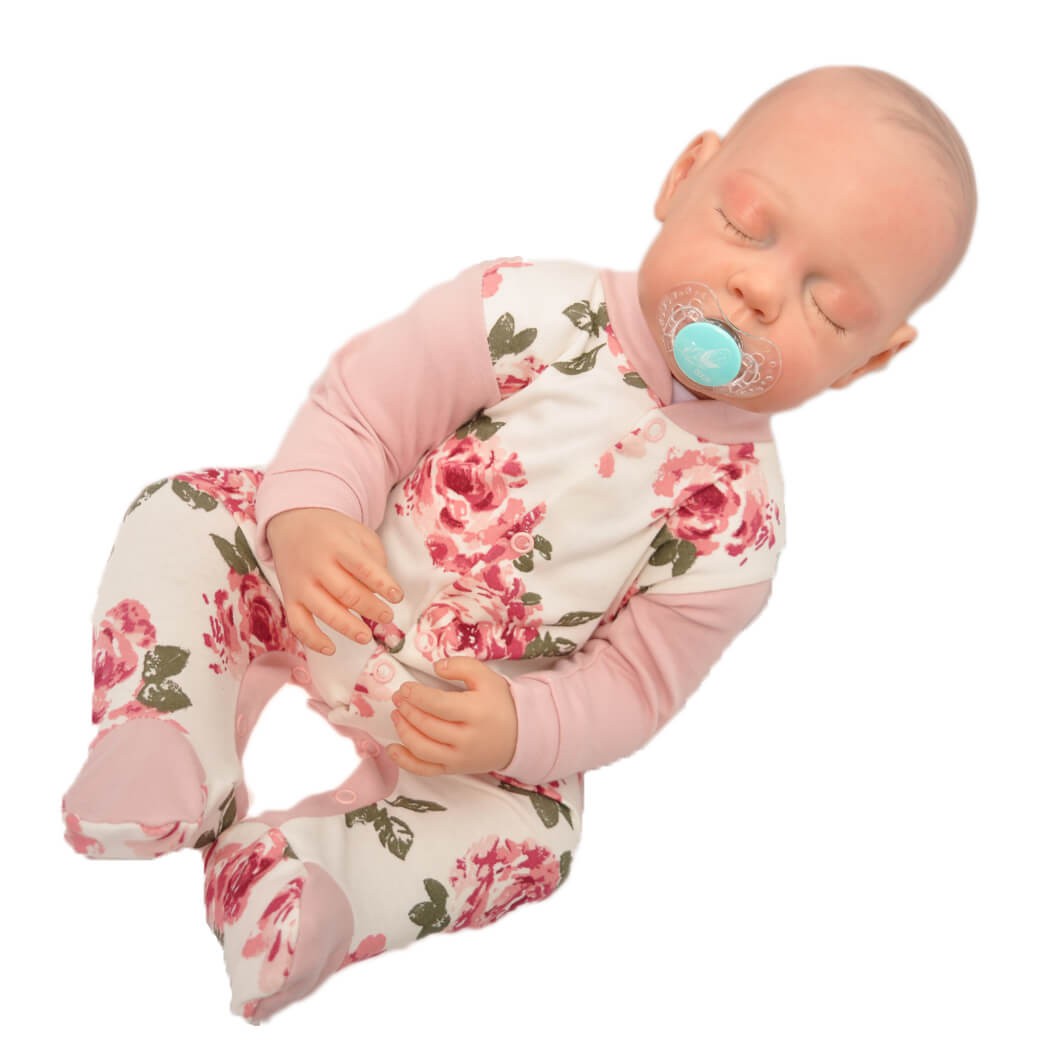 Pajac bawełniany dla wcześniaka w różowej kolorystyce z nadrukiem w kwiaty.