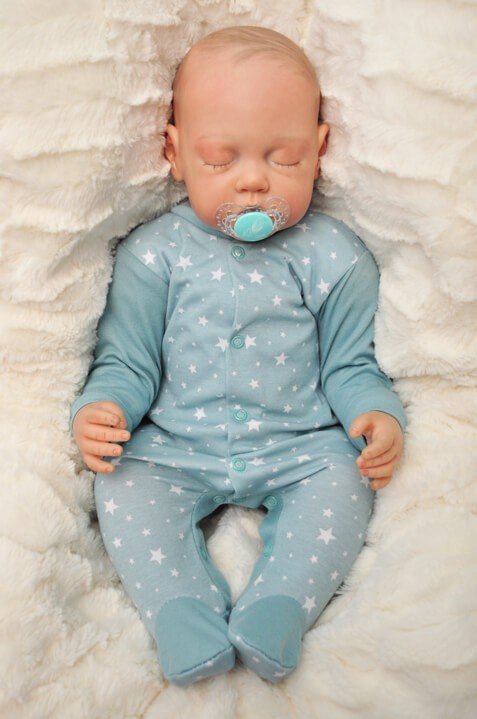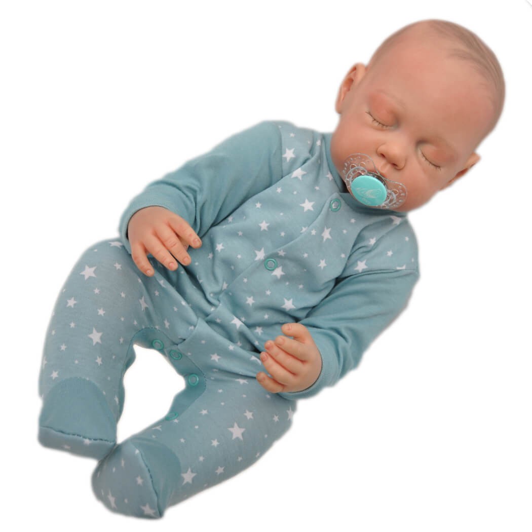 Pajac bawełniany dla wcześniaka w zimno-niebieskiej kolorystyce z nadrukiem w gwiazdki.