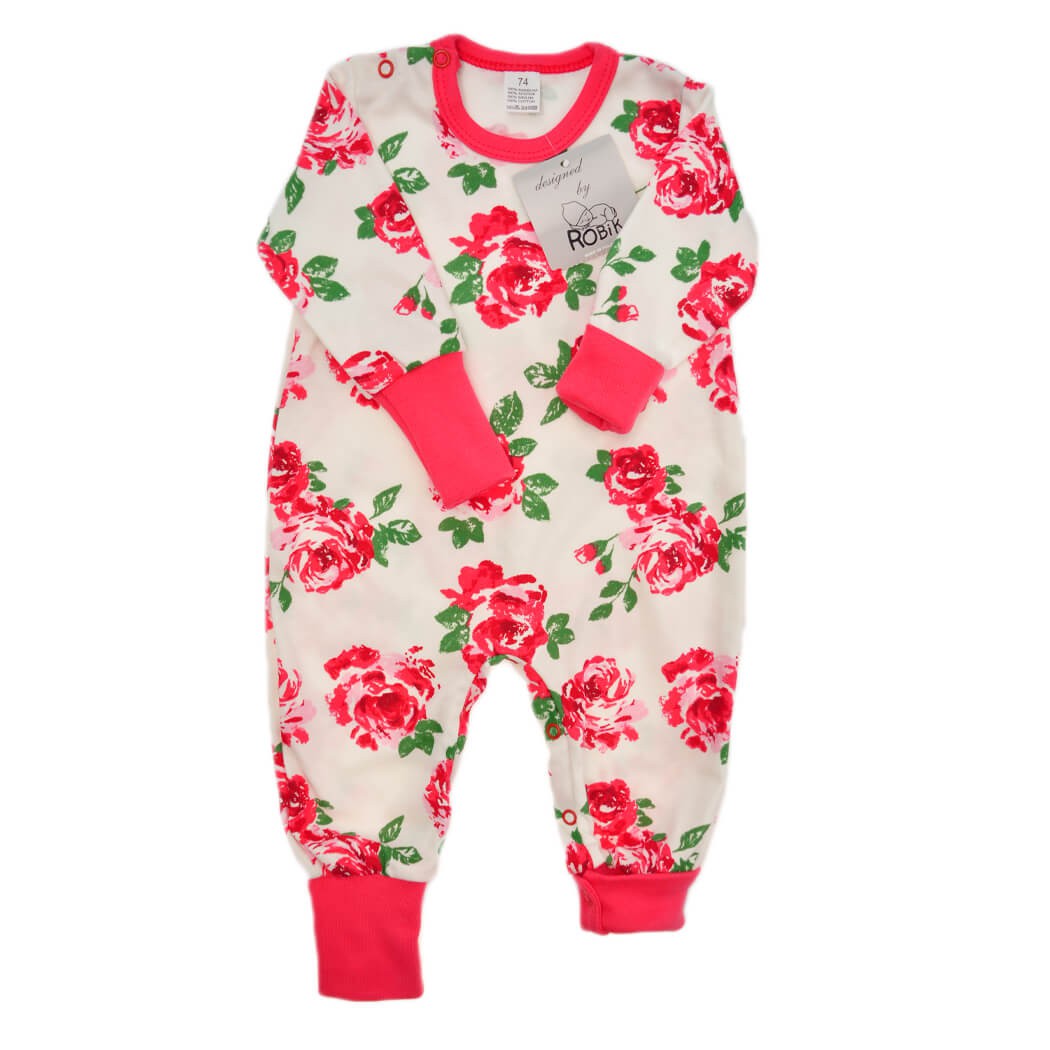 Bawełniany pajacyk bez stópek zapewniający komfort oraz wygodę ruchów malucha. Zapinany na napki na ramieniu oraz w kroku tak, aby łatwo można było ubrać i przewinąć maluszka. Uszyty z 100% bawełny drukowanej w róże, wykończonej mankietami przy rękawach i nogawkach oraz lamówką przy dekolcie.