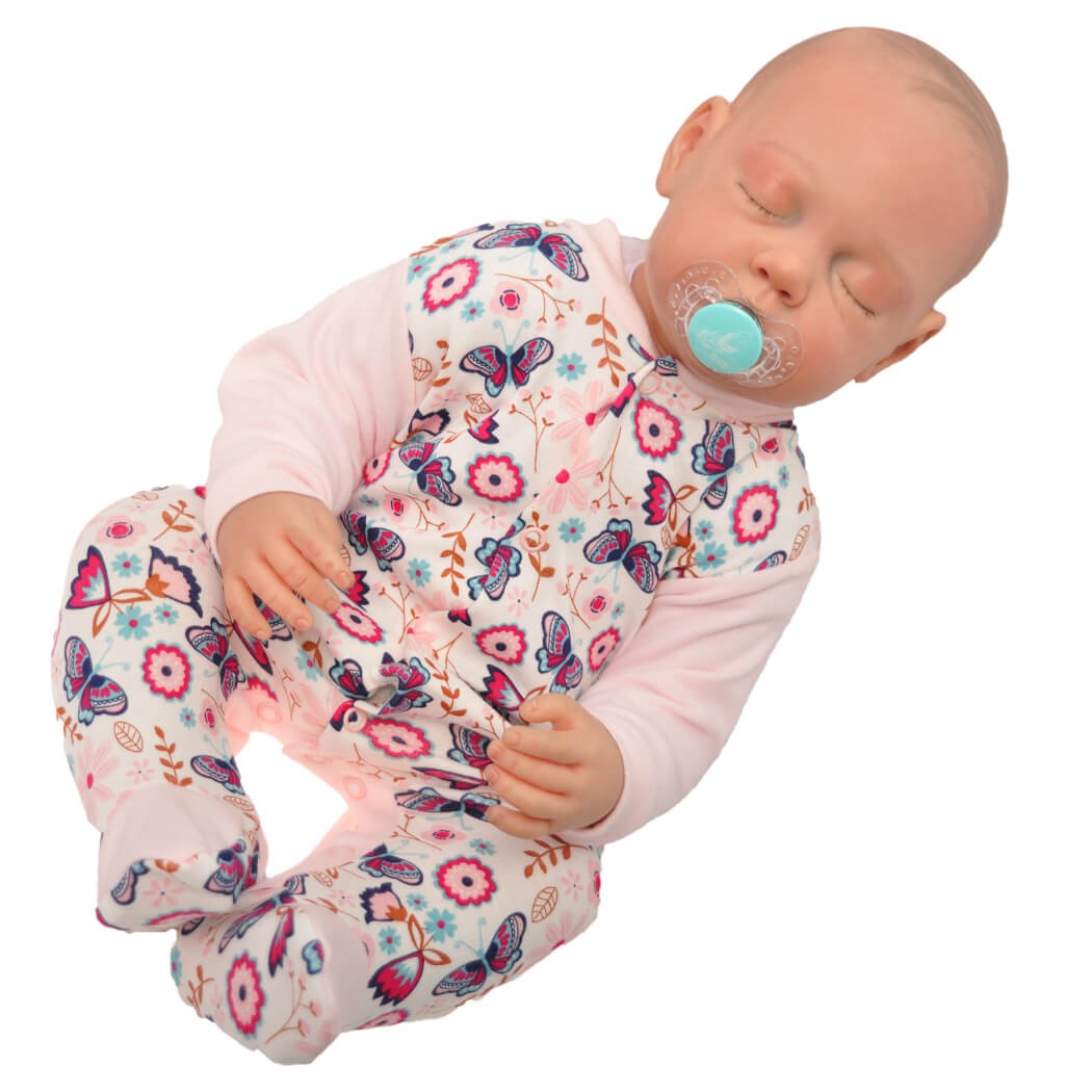 Pajac bawełniany dla wcześniaka w różowej kolorystyce z nadrukiem w motylki.
