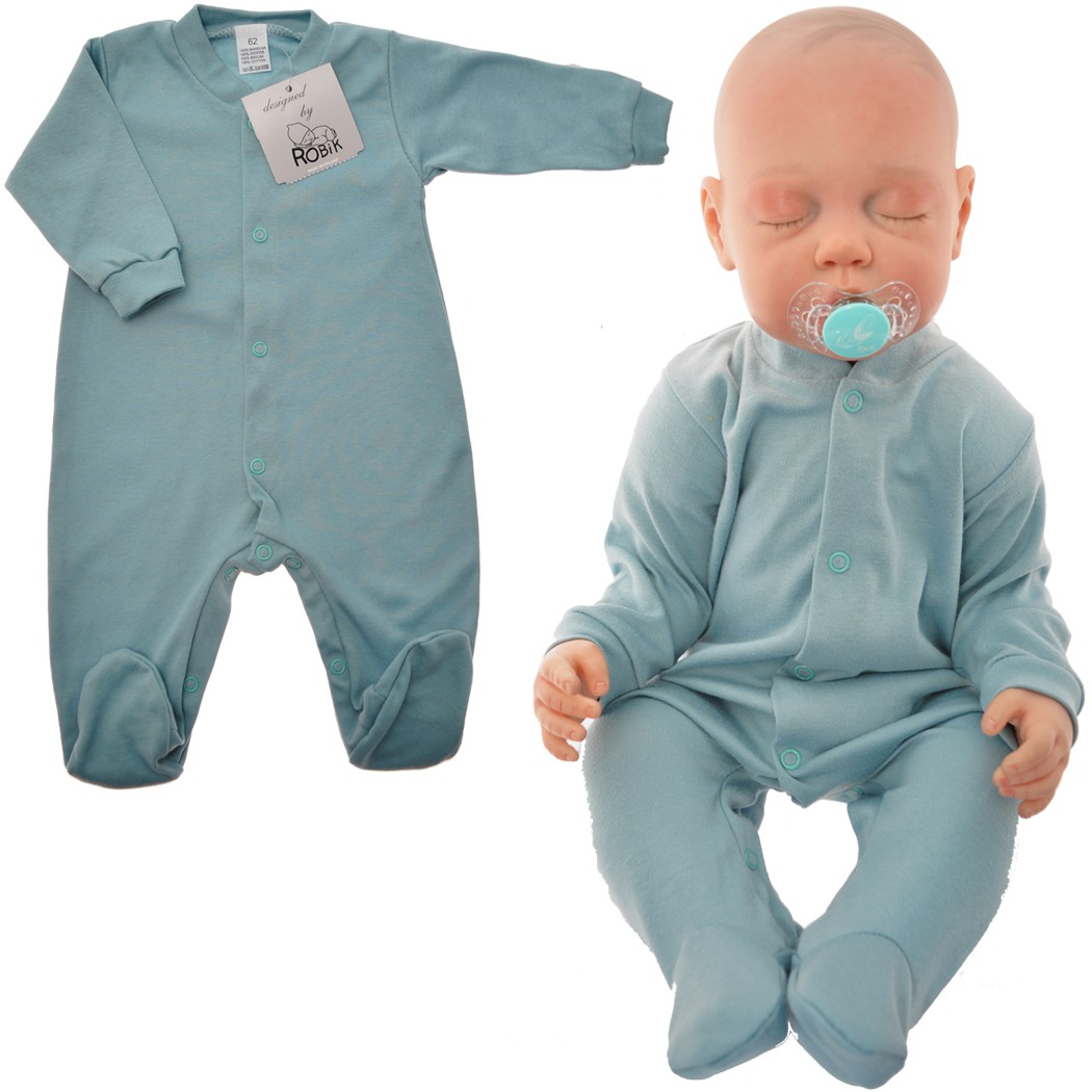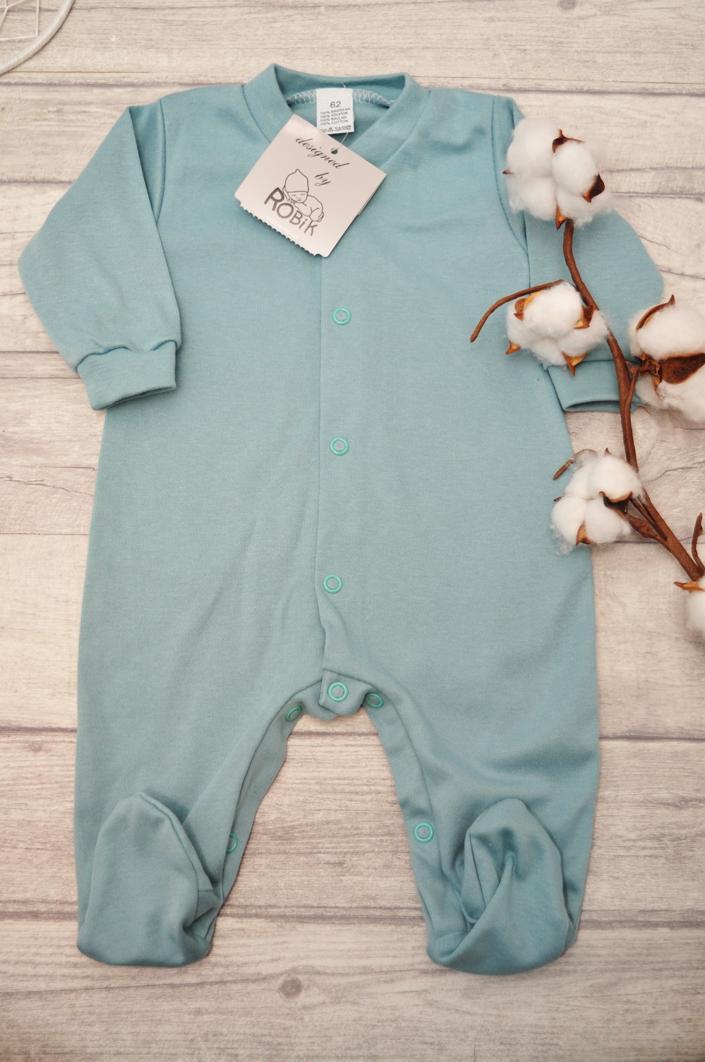 Pajac bawełniany niemowlęcy w kolorze szaro-miętowym.