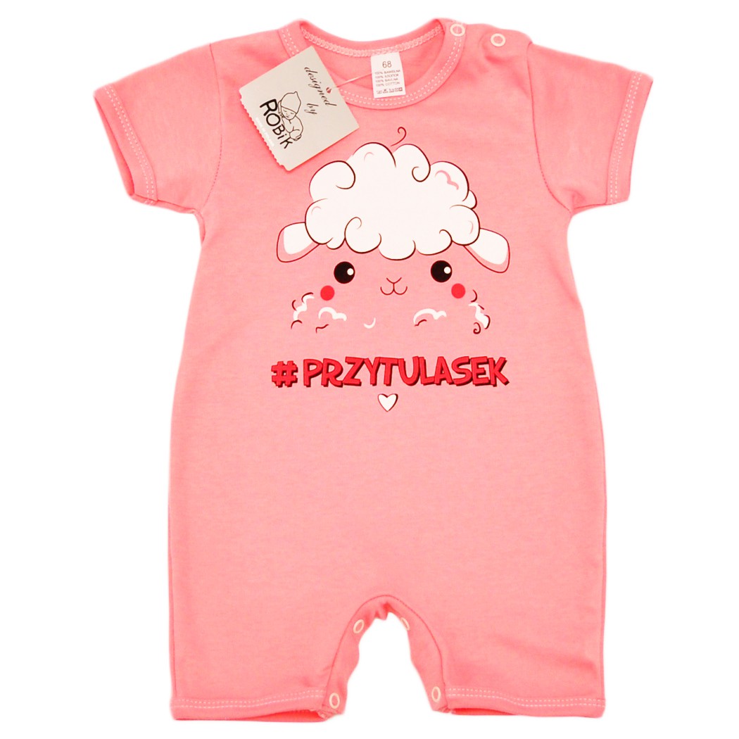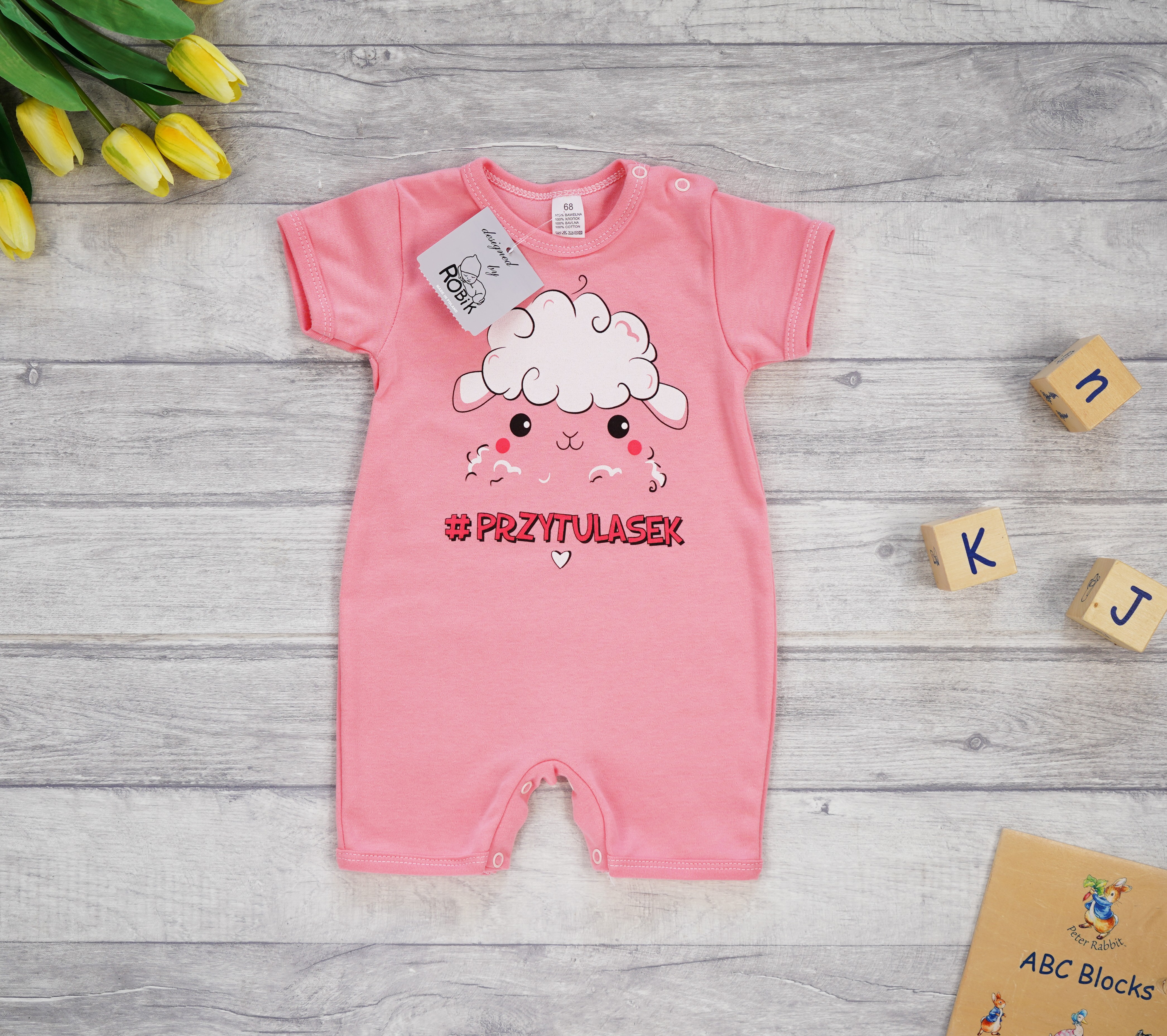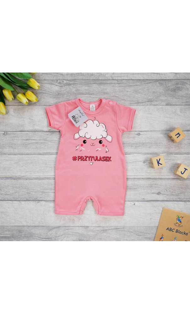 Łososiowy rampers z krótkim rękawem na lato z napisem #PRZYTULASEK.