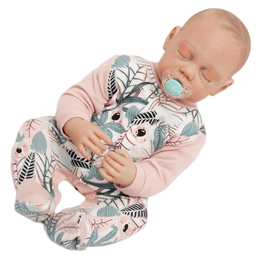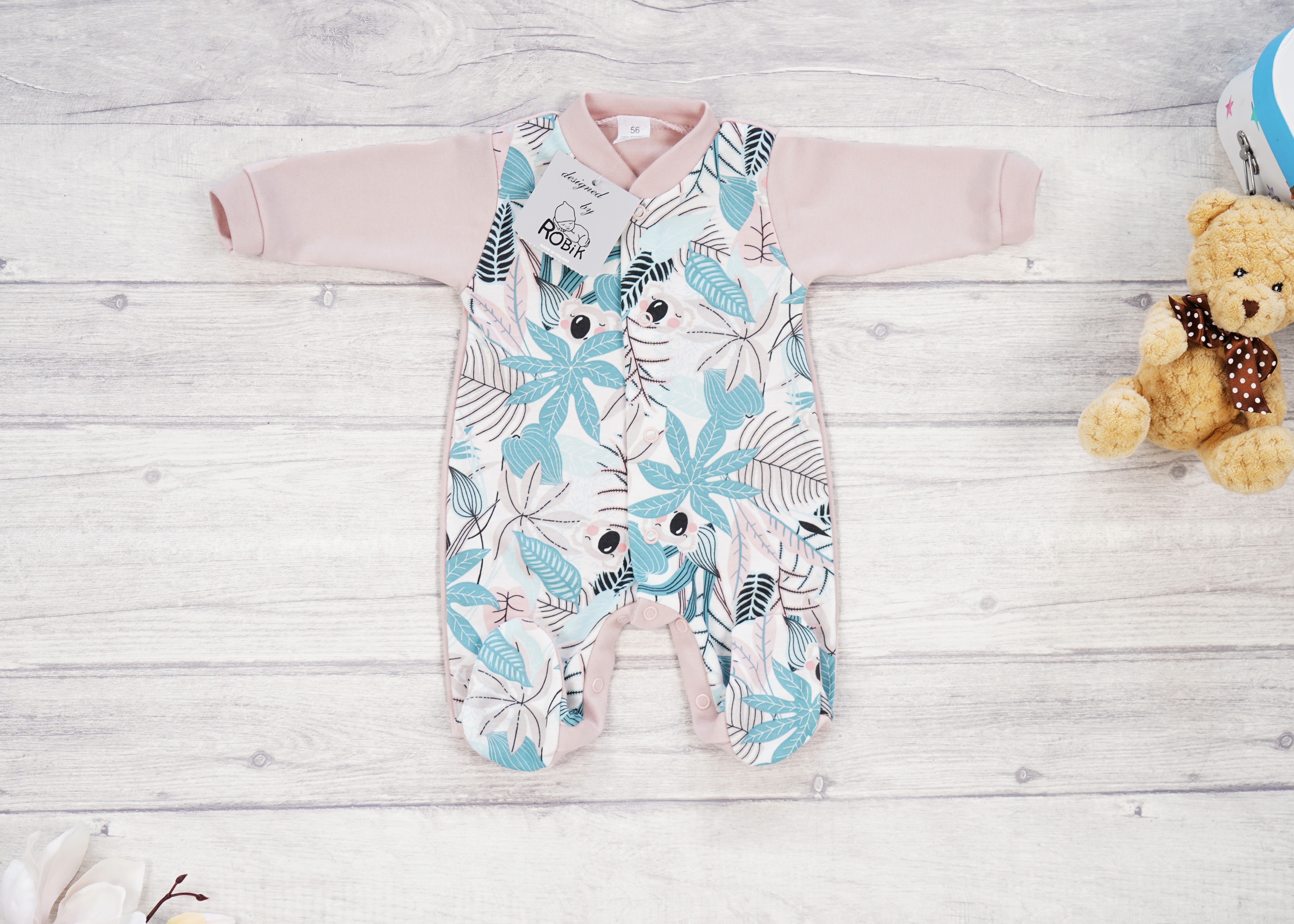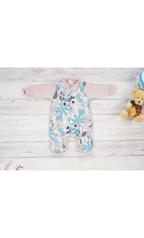 Pajac pajacyk bawełniany pudrowy róż w misie koala liście wzór 377r