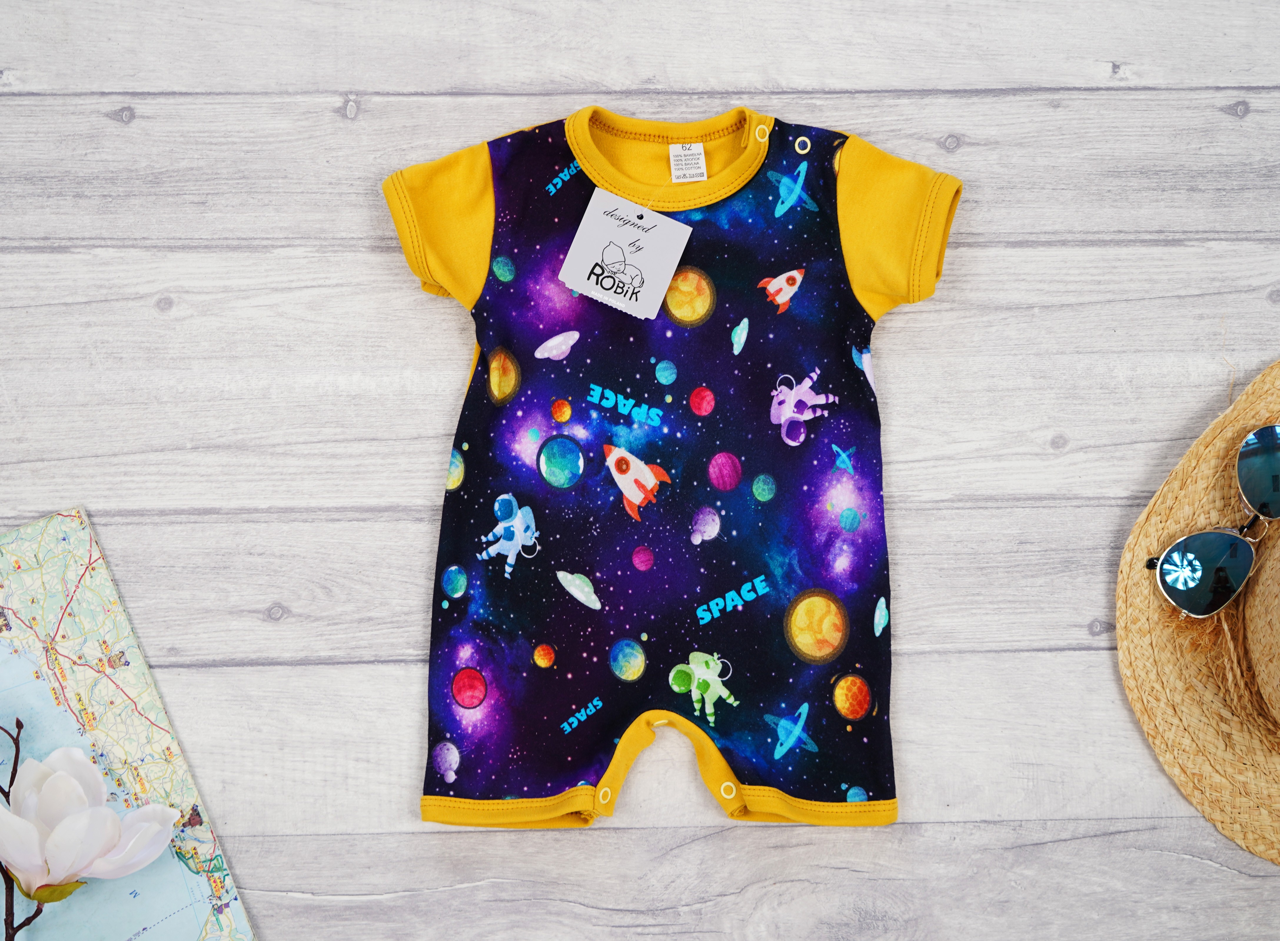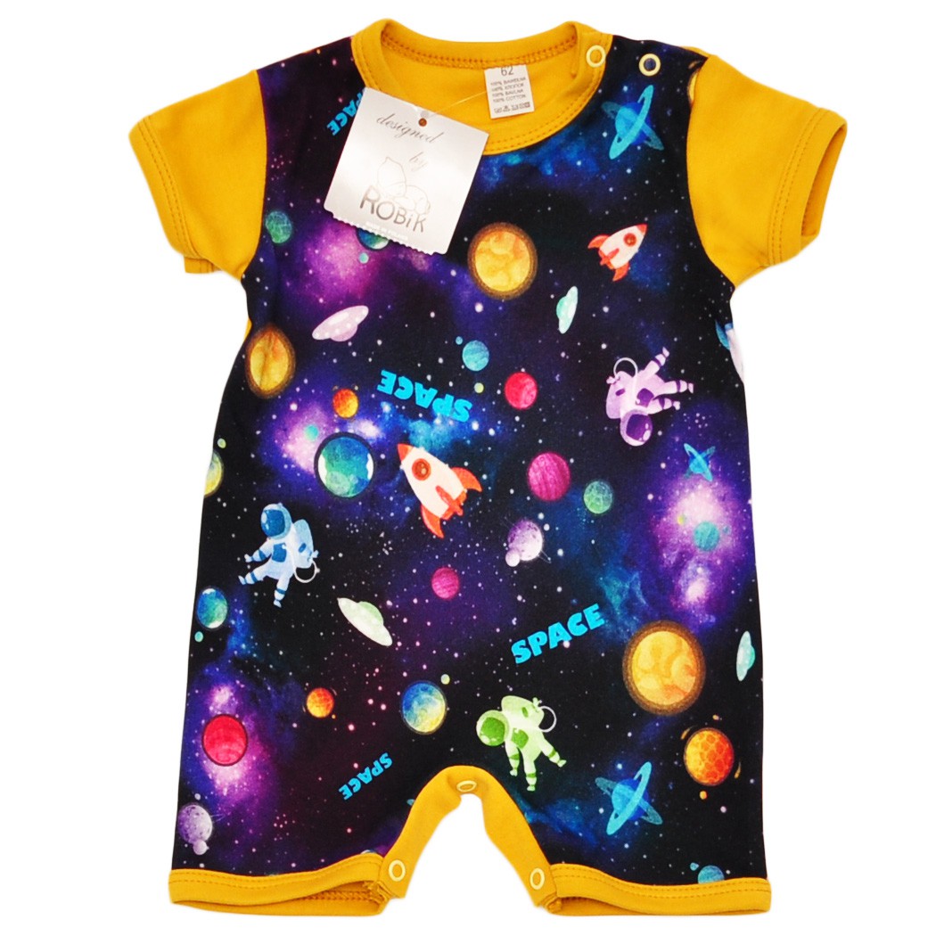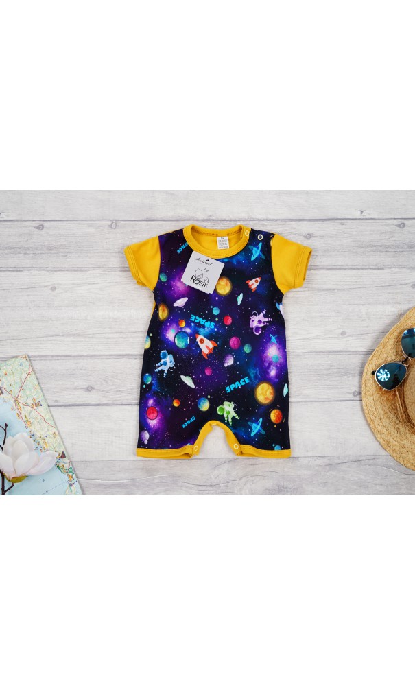 Musztardowy rampers z krótkim rękawem na lato z nadrukiem kosmosu.
