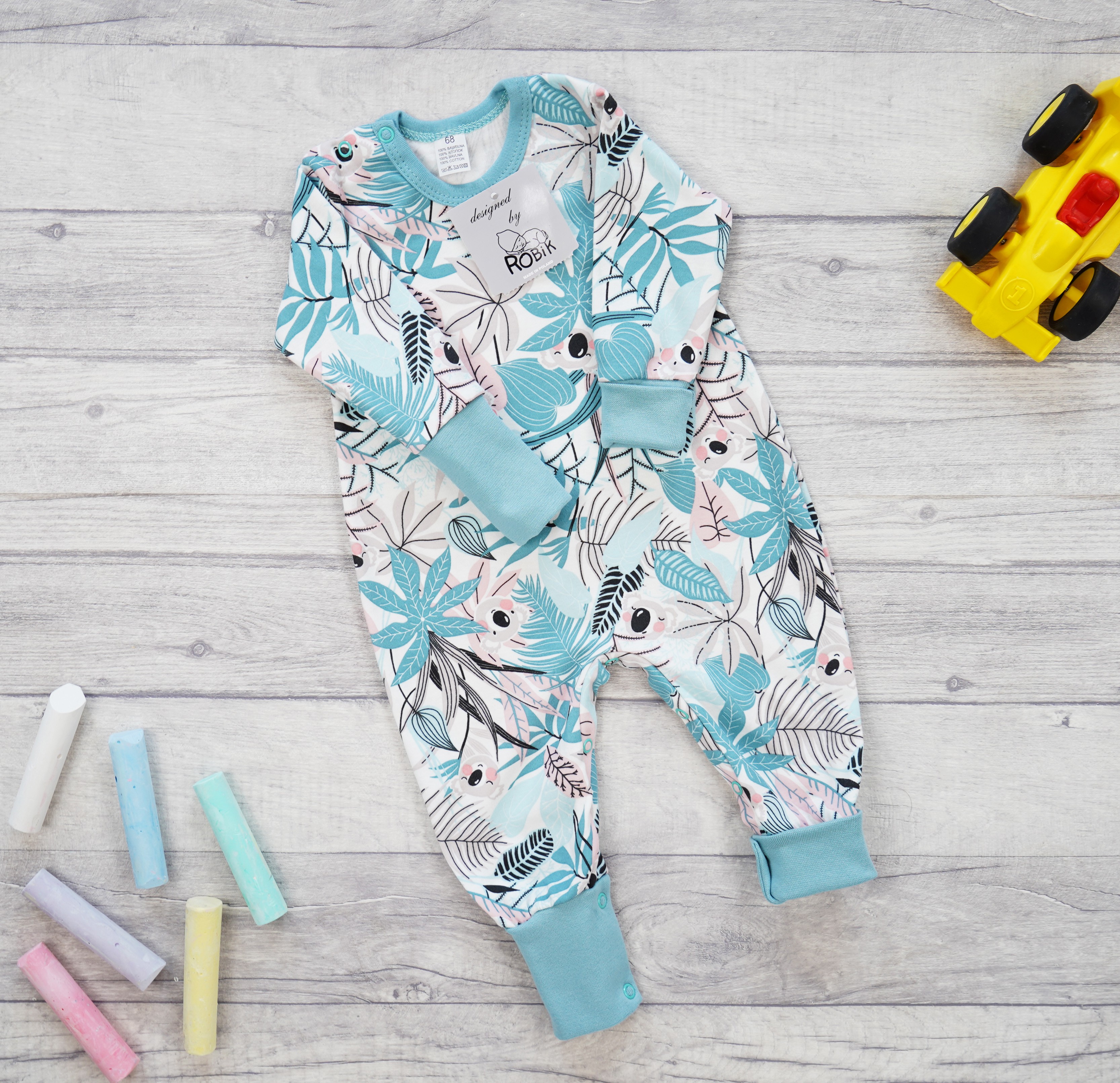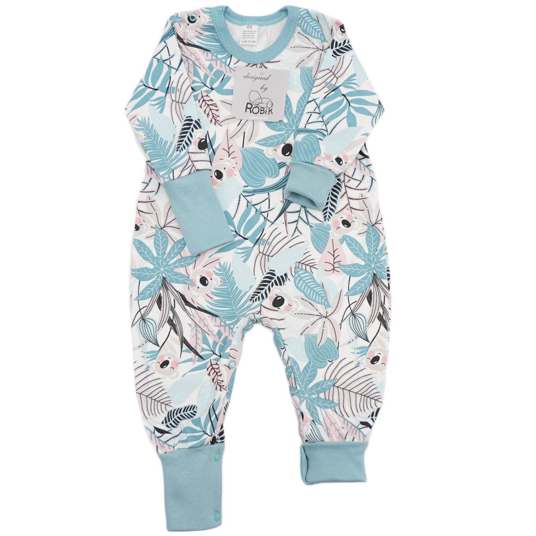 Niebieski pajac bez stópek w misie koala może być używany m.in. jako pajac do spania. Dzięki zastosowaniu odwijanych mankietów i nogawek, maluch tak szybko z nich nie wyrasta. A w razie potrzeby w chłodniejsze dni i noce na stópki polecamy bawełniane skarpetki niemowlęce.