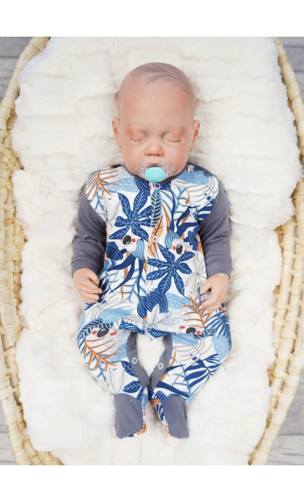 Pajac bawełniany niemowlęcy w kolorystyce biało- grafitowej z nadrukiem w misie koala.