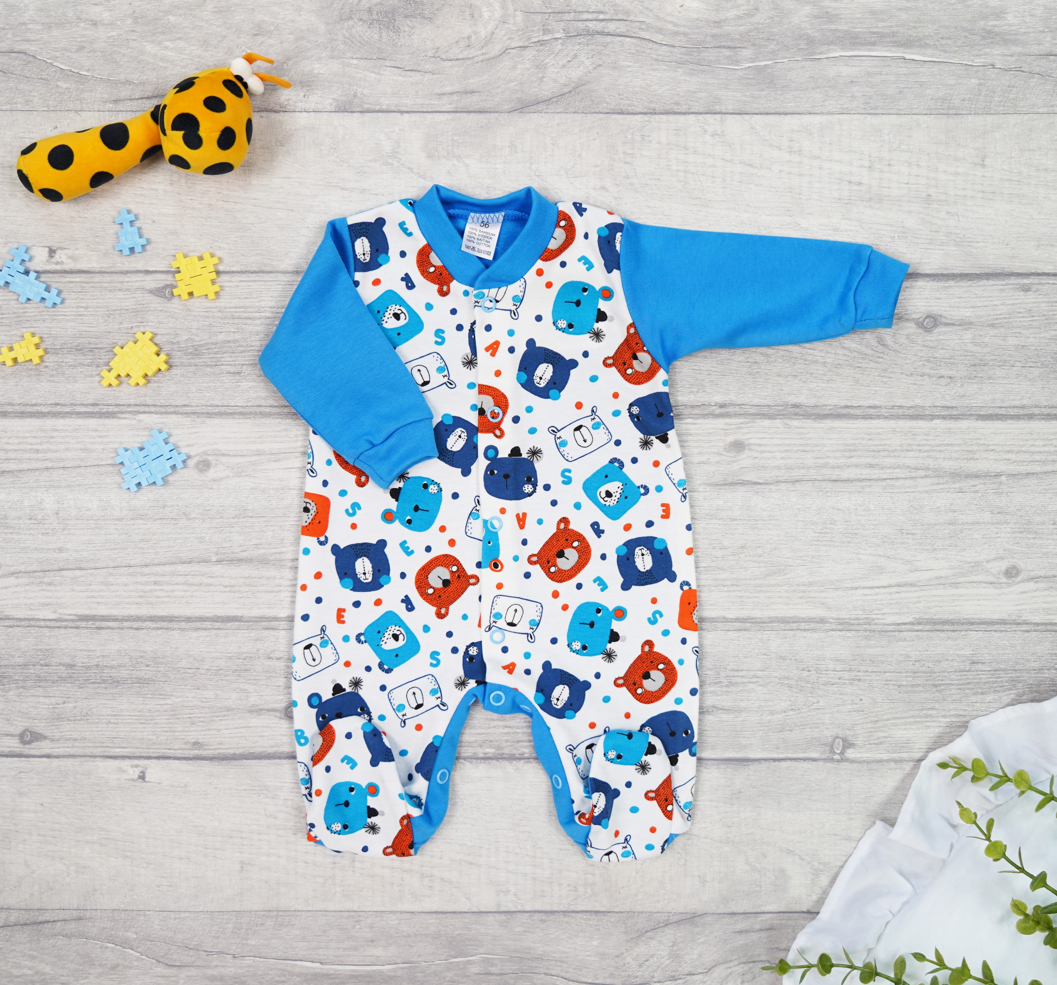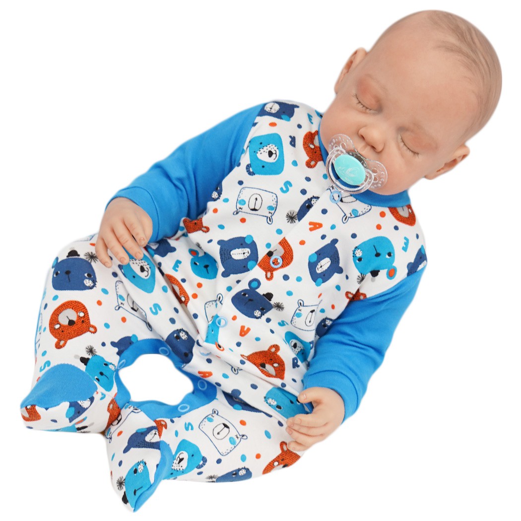 Pajac niemowlęcy niebieski w misie i kropki