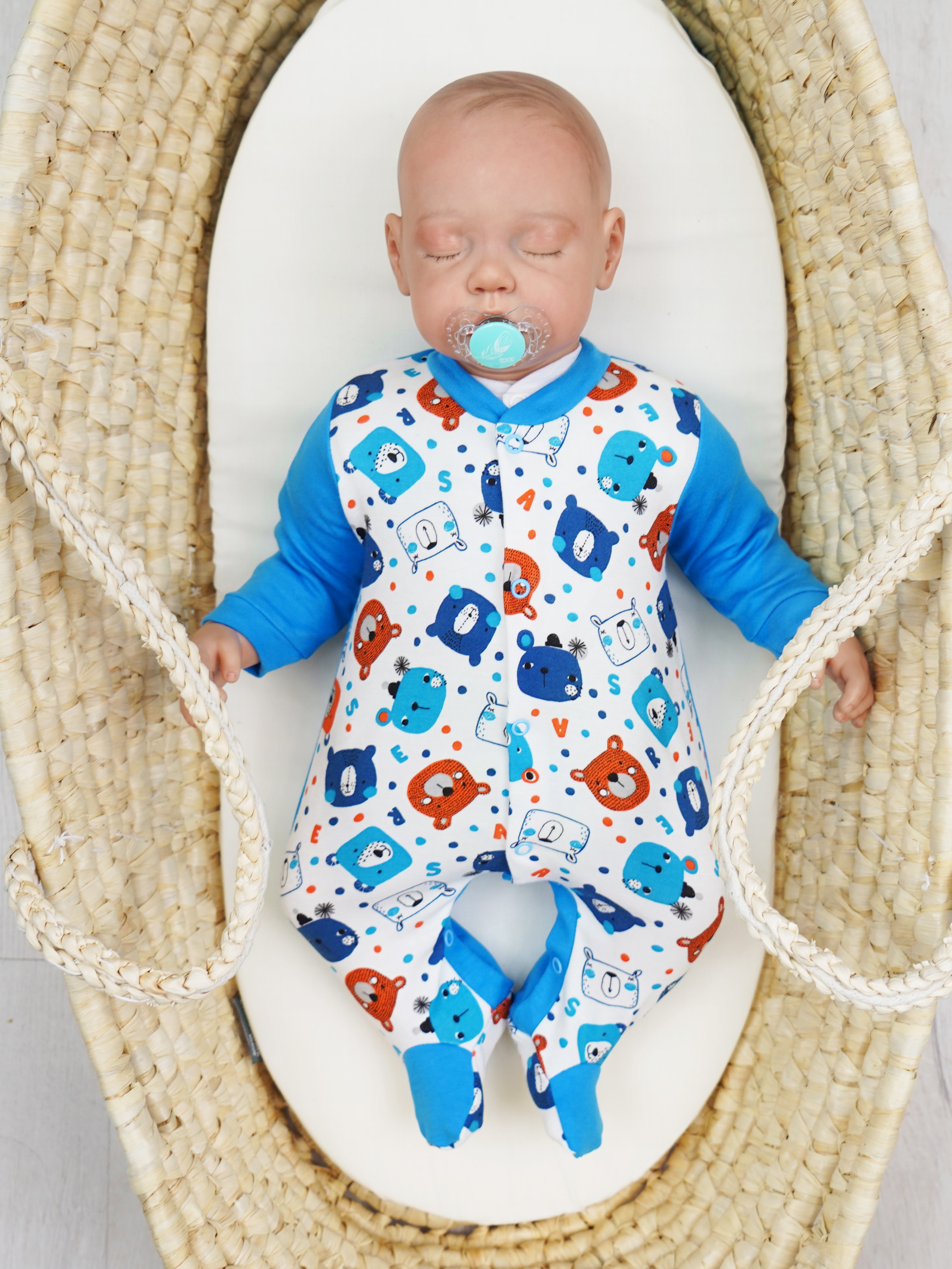 - pajacyk zapinany jest na napki przez całą długość ubranka oraz w kroku tak aby łatwo można było ubrać i przewinąć maluszka