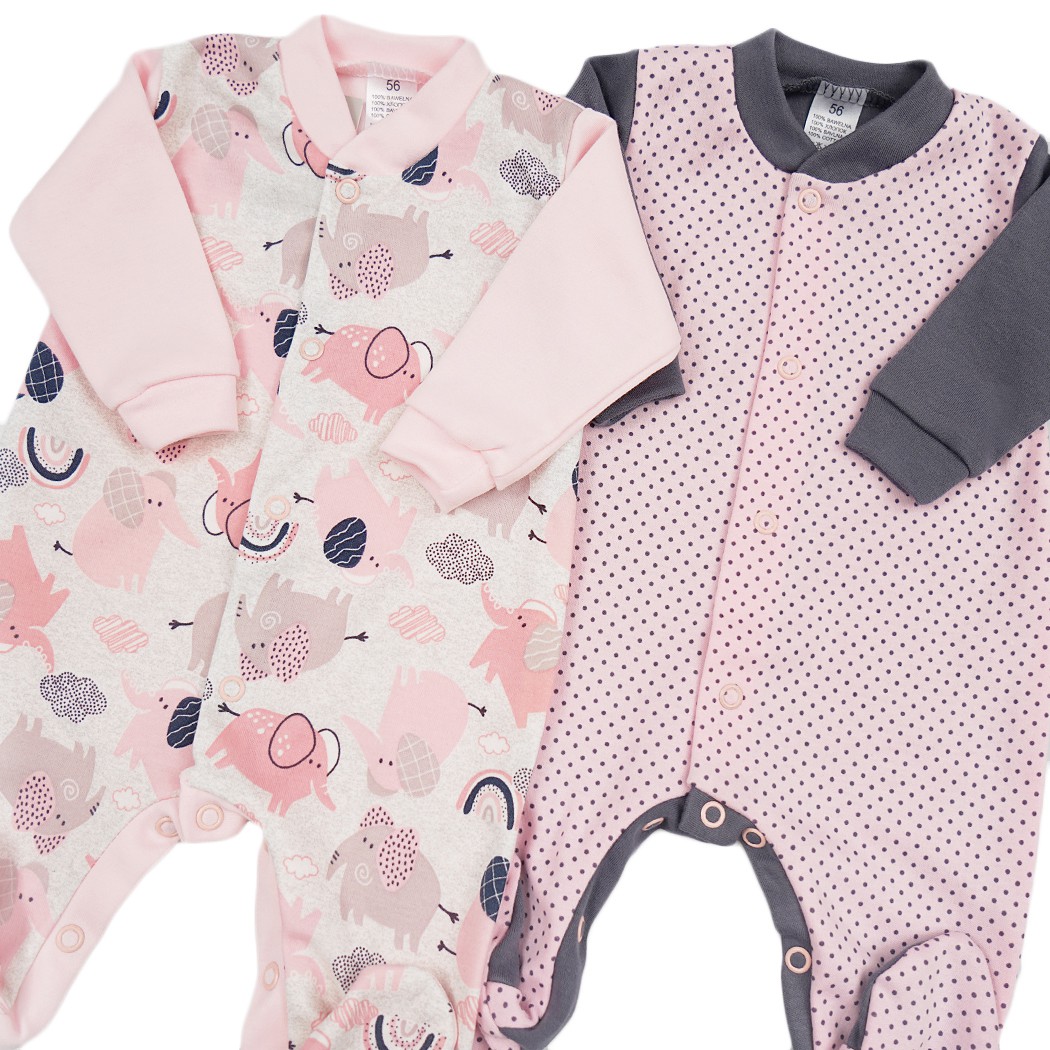 2pak pajacyków bawełnianych niemowlęcych w kolorystyce różowo- grafitowej w kropki i słoniki.