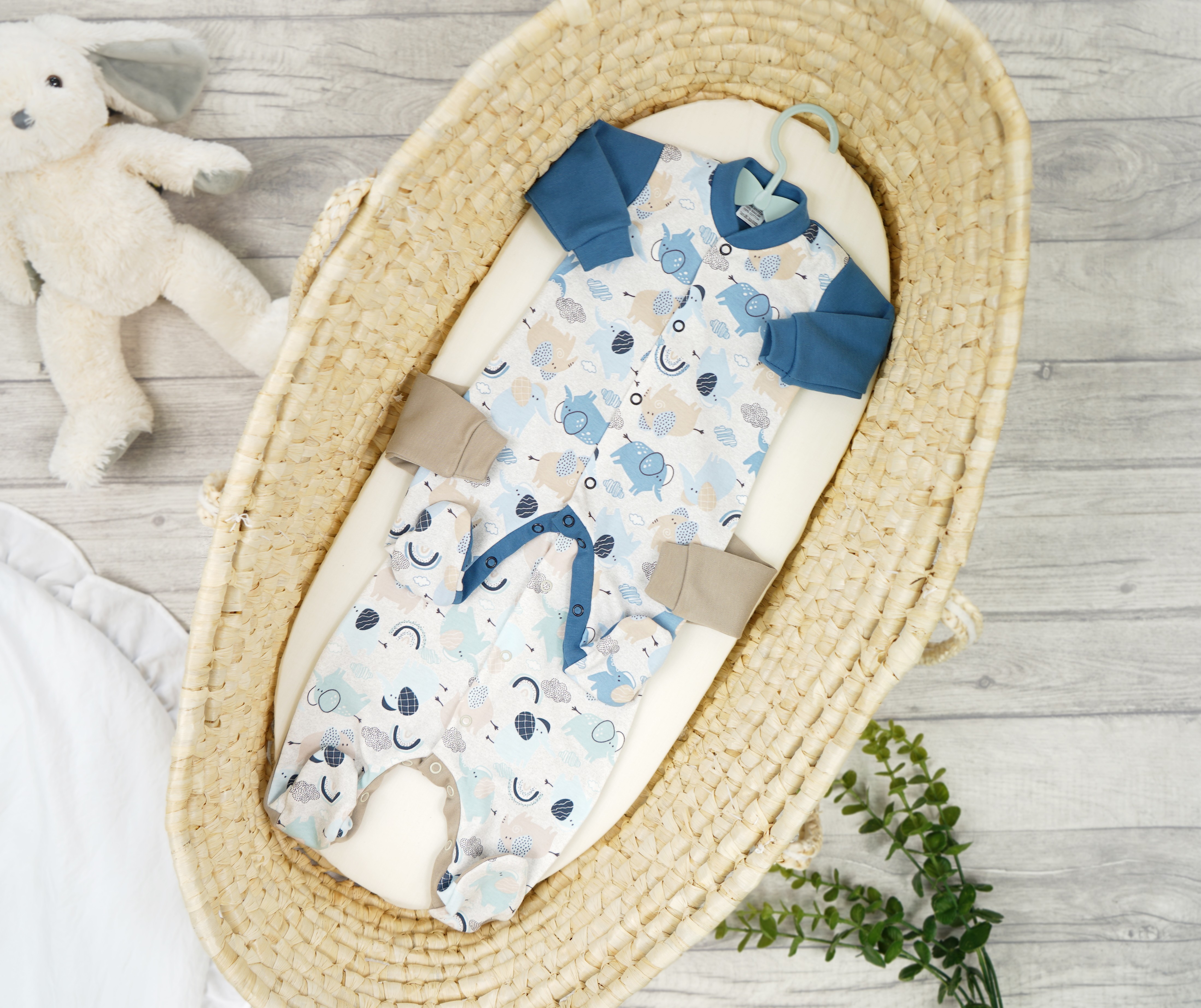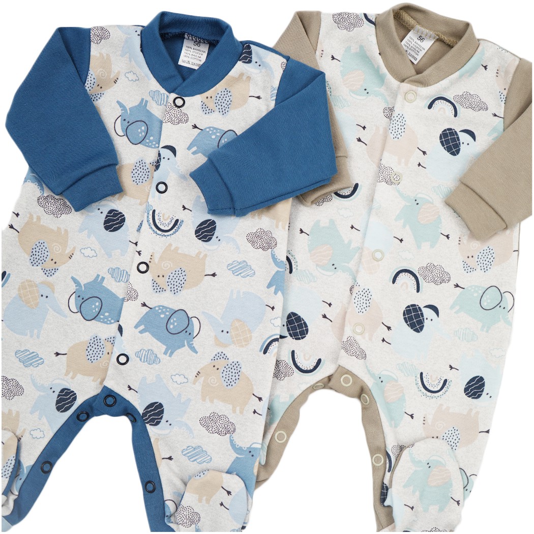 2pak pajacyków bawełnianych niemowlęcych w kolorystyce niebiesko- beżowej w słoniki.