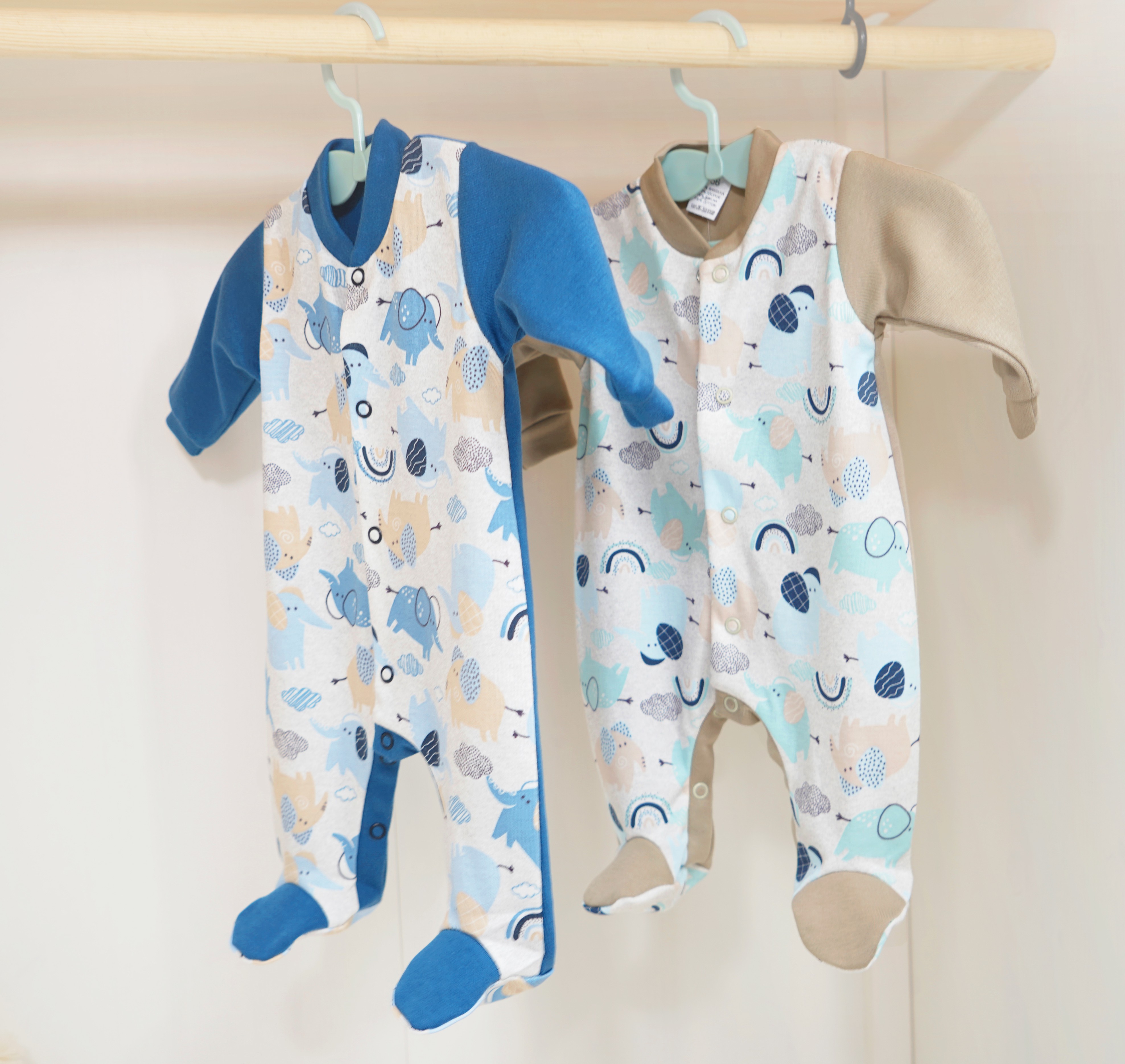 2pak pajacyków bawełnianych niemowlęcych w kolorystyce niebiesko - beżowym w słoniki.