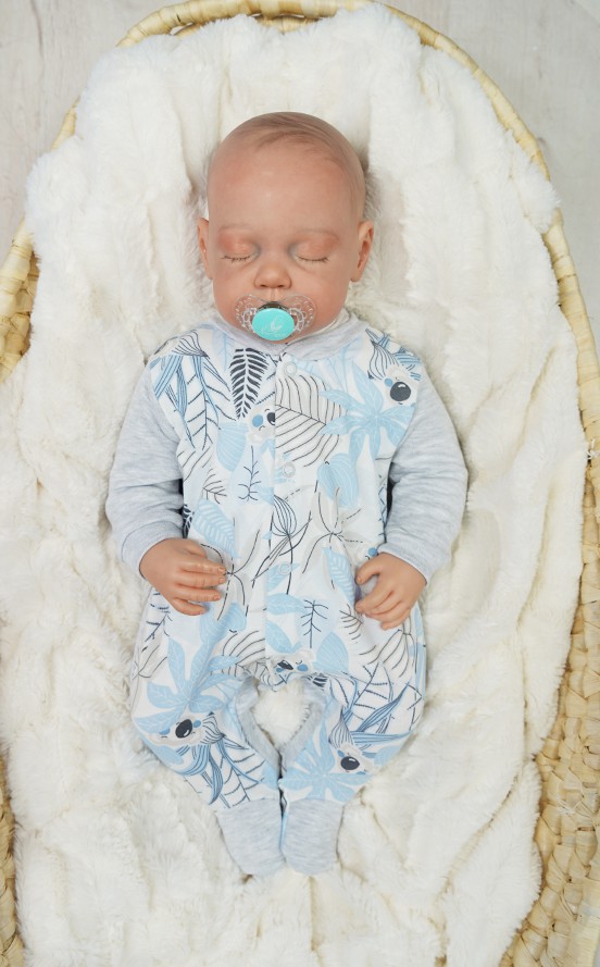 Pajacyk niemowlęcy ze stópkami, zapinany na bezniklowe napki przez całą długość ubranka oraz w kroku tak aby łatwo można było ubrać i przewinąć maluszka. Wykonany z 100% bawełny dzięki czemu nie podrażnia skóry dziecka.