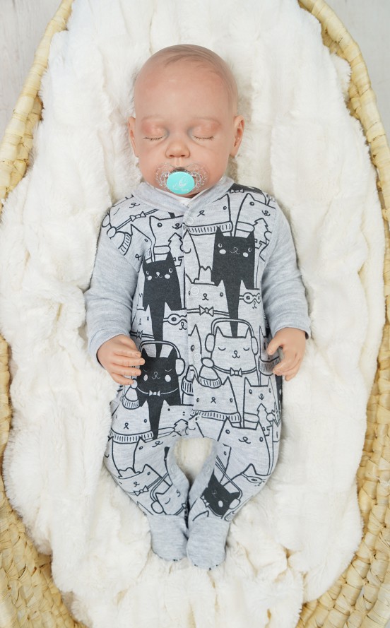 Pajac bawełniany niemowlęcy w kolorystyce szarej z nadrukiem w koty