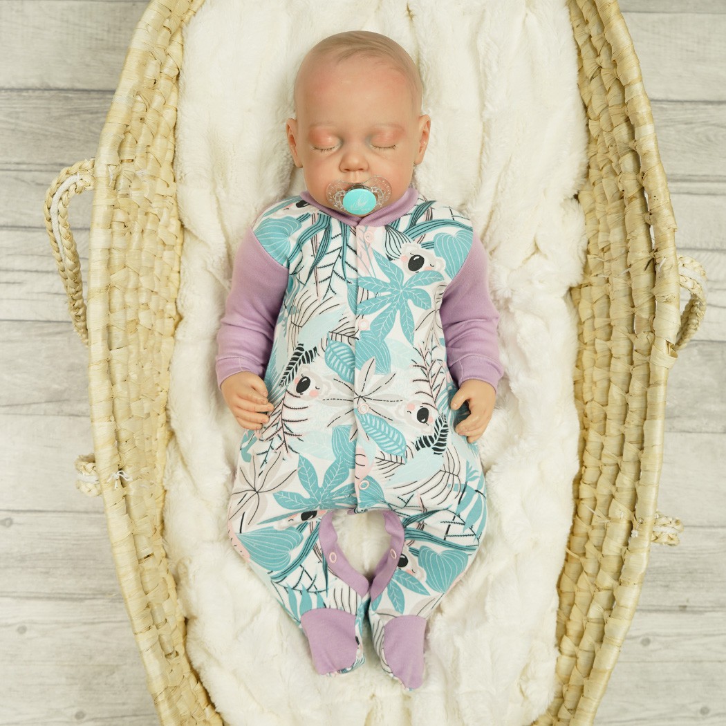 Pajacyk bawełniany ze stópkami, zapinany na bezniklowe napki przez całą długość ubranka oraz w kroku tak aby łatwo można było ubrać i przewinąć maluszka. Pajac niemowlęcy wykonany z 100% bawełny dzięki czemu nie podrażnia skóry dziecka.