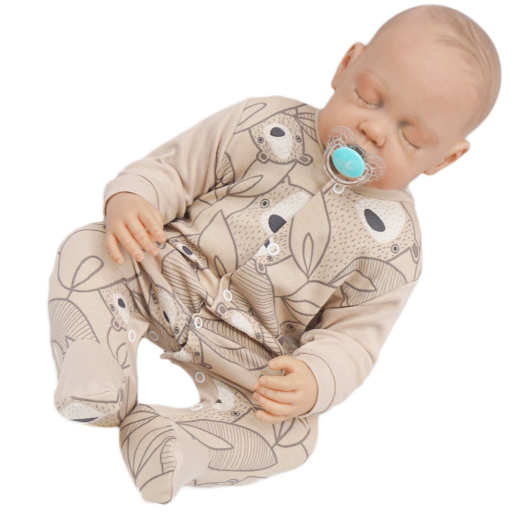 Bawełniany pajacyk dla niemowląt beżowy ze stópkami, zapinany na bezniklowe napki przez całą długość ubranka oraz w kroku tak aby łatwo można było ubrać i przewinąć maluszka. Beżowy pajacyk dla niemowląt wykonany z 100% bawełny dzięki czemu nie podrażnia skóry dziecka.