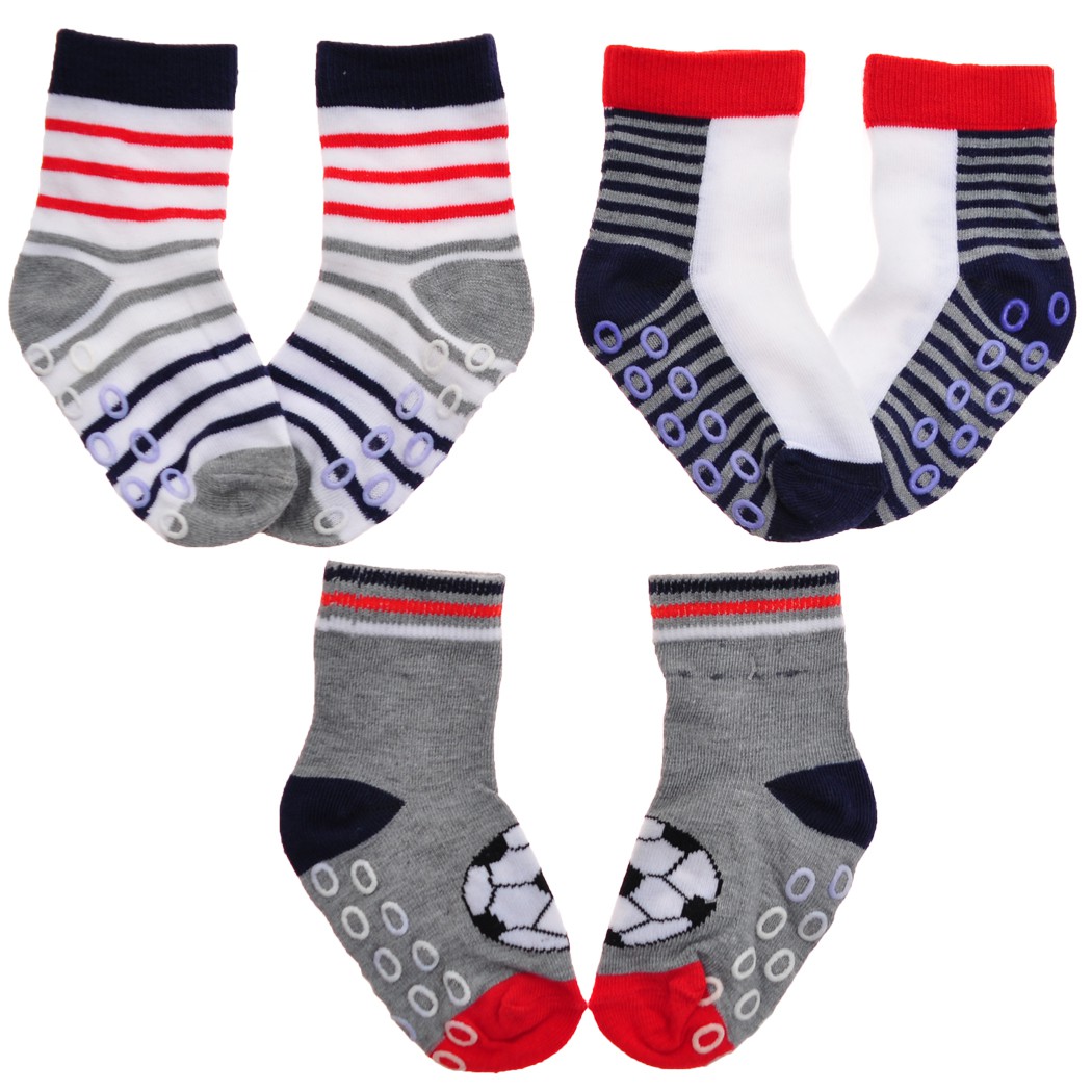 Oferowany produkt to 3-pak bawełnianych skarpetek antypoślizgowych dla małych chłopców. Skarpetki dla chłopca z ABS służą nie tylko jako ozdoba, ale przede wszystkim chronią przed upadkiem w wyniku poślizgu. Skarpety bawełniane chłopięce przyczyniają się do utrzymania prawidłowej temperatury ciała dziecka. Zapewniają doskonały przepływ powietrza dlatego można nosić je nawet w bardzo ciepłe dni. Skarpetki dla chłopców to obowiązkowy element garderoby już od narodzin. Delikatny ściągacz nie uciska nóżek.