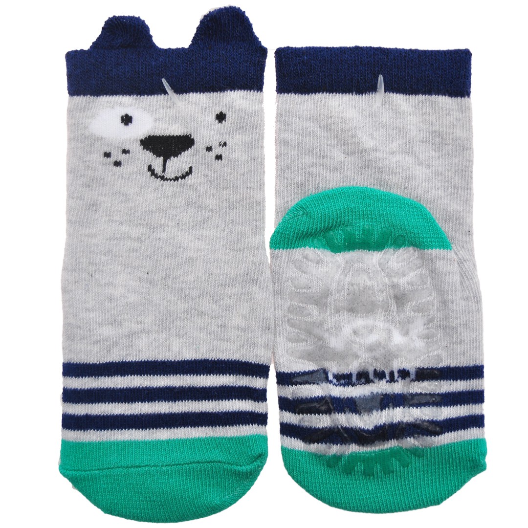Skarpetki dla chłopców z silikonowym ABS. Antypoślizgowa podeszwa zabezpiecza przed niekontrolowanym poślizgiem, co jest szczególnie ważne kiedy nasze dzieci stawiają swoje pierwsze kroki a trójwymiarowe uszka i nadruk misia na oferowanych skarpetkach nadaje im szczególnego uroku.