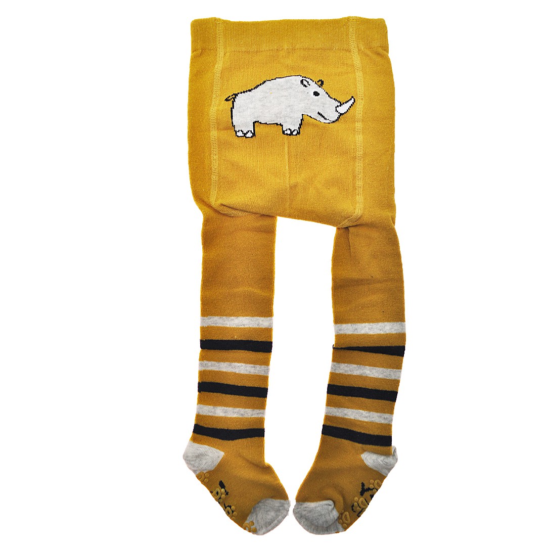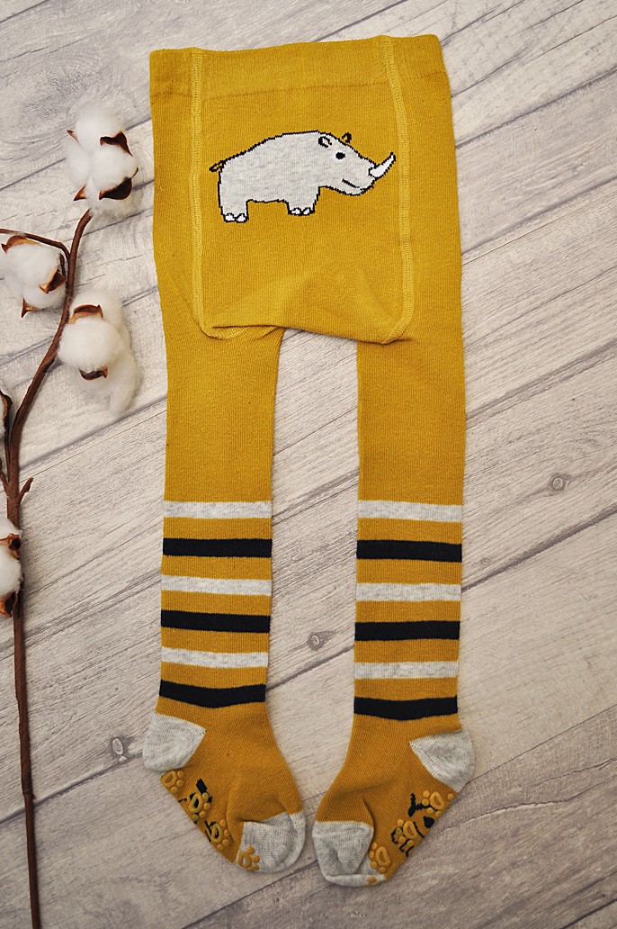 Musztardowe rajstopki z nosorożcem na pupie i ABS na podeszwach stópek.
