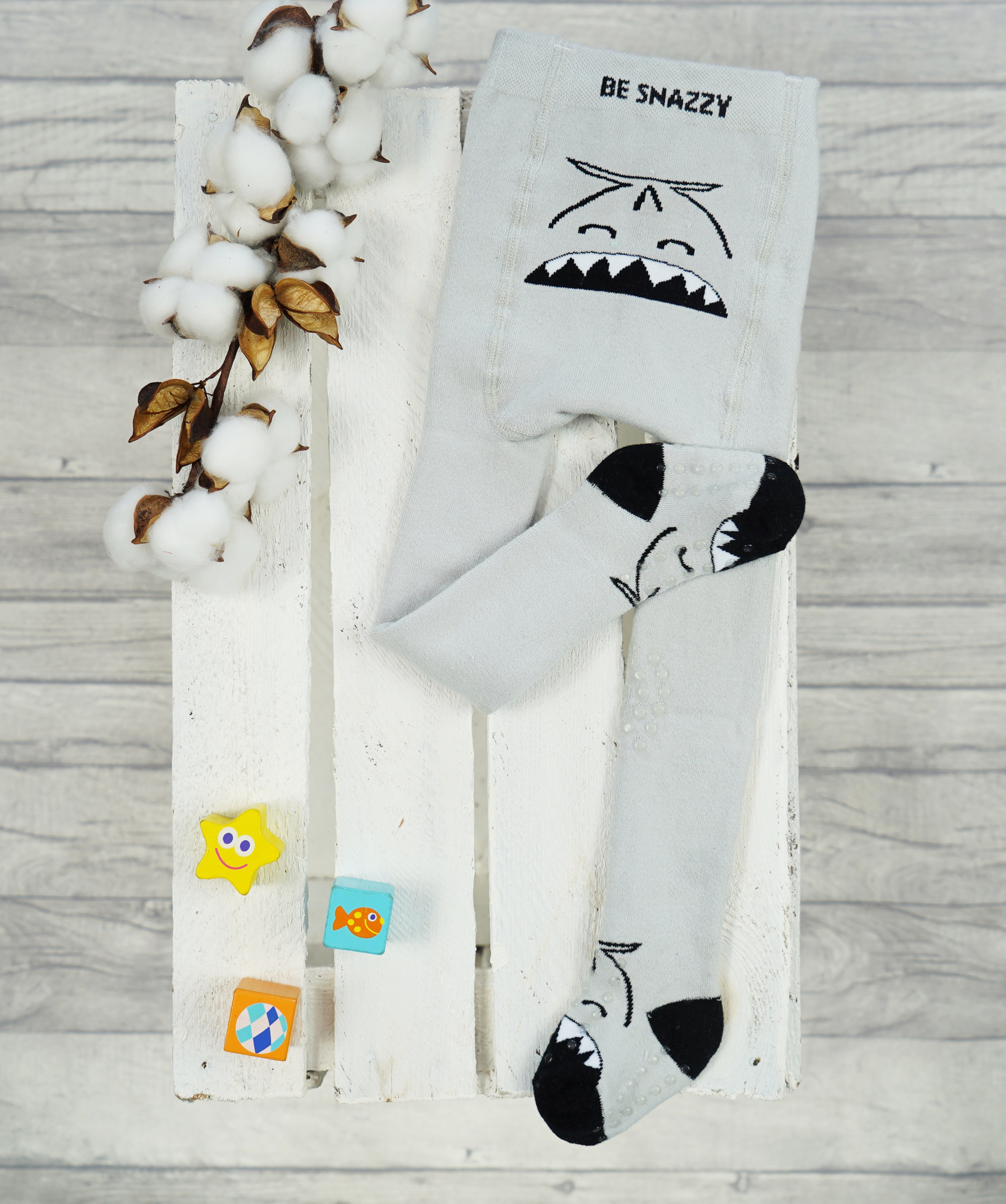 Popielate rajstopki frotte dla chłopca z rekinem.