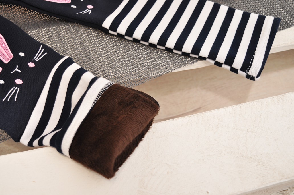 Legginsy ocieplane futerkiem dla dziewczynki dopasowują się do ciała, nie krępują ruchów i świetnie się prezentują. Wykonane z 2 typów materiału, od pasa do kolan gładka dzianina w kolorze granatowym a poniżej kolan w stylowe biało-granatowe paski. Wyjątkową ozdobą tych dziewczęcych legginsów są różowe, błyszczące aplikacje z króliczkami umiejscowione na kolanach getrów. W pasie posiadają wygodną płaską gumkę.