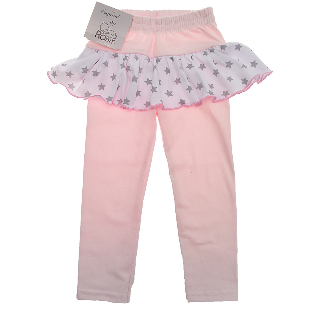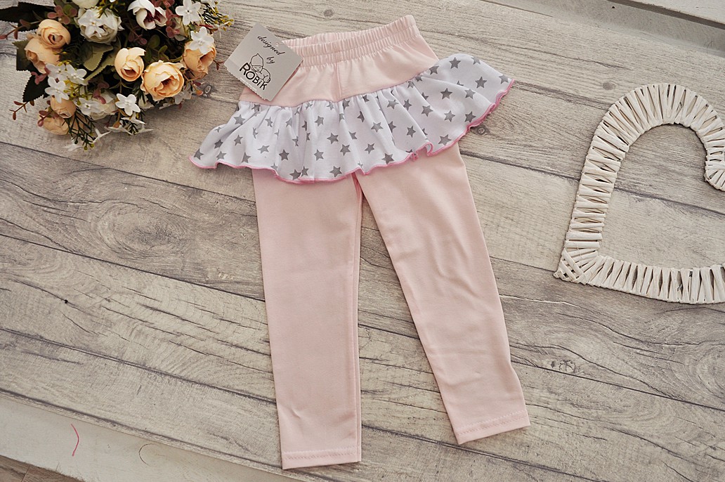 Dziewczęce legginsy w kolorze pudrowego różu z falbanką w gwiazdki.