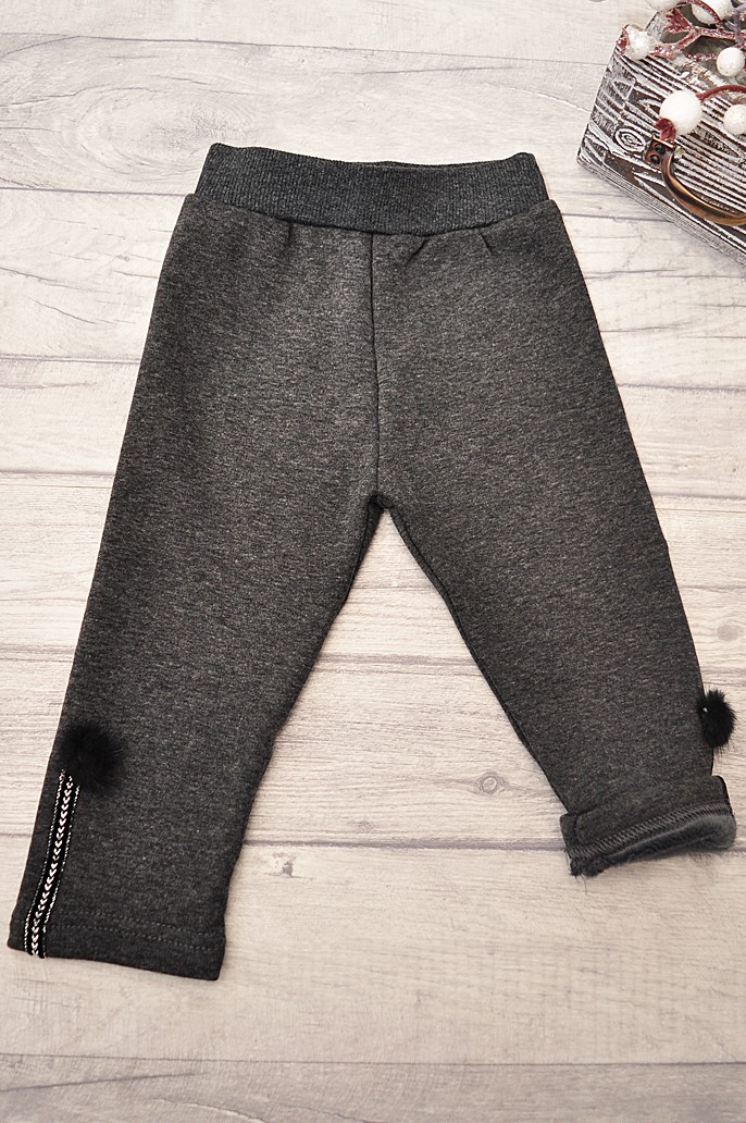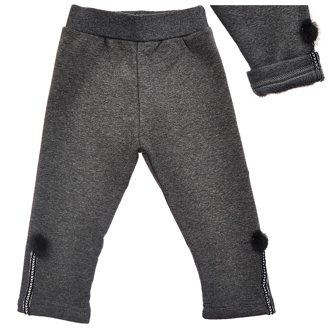 Getry na futerku, które dopasowują się do ciała, nie krępują ruchów i świetnie się prezentują. Legginsy dziecięce wykonane z dzianiny w kolorze grafitowym. W pasie posiadają wygodną płaską gumkę a końcówki ich nogawek zostały wykończone małym srebrnym lampasem z futerkowym pomponem.