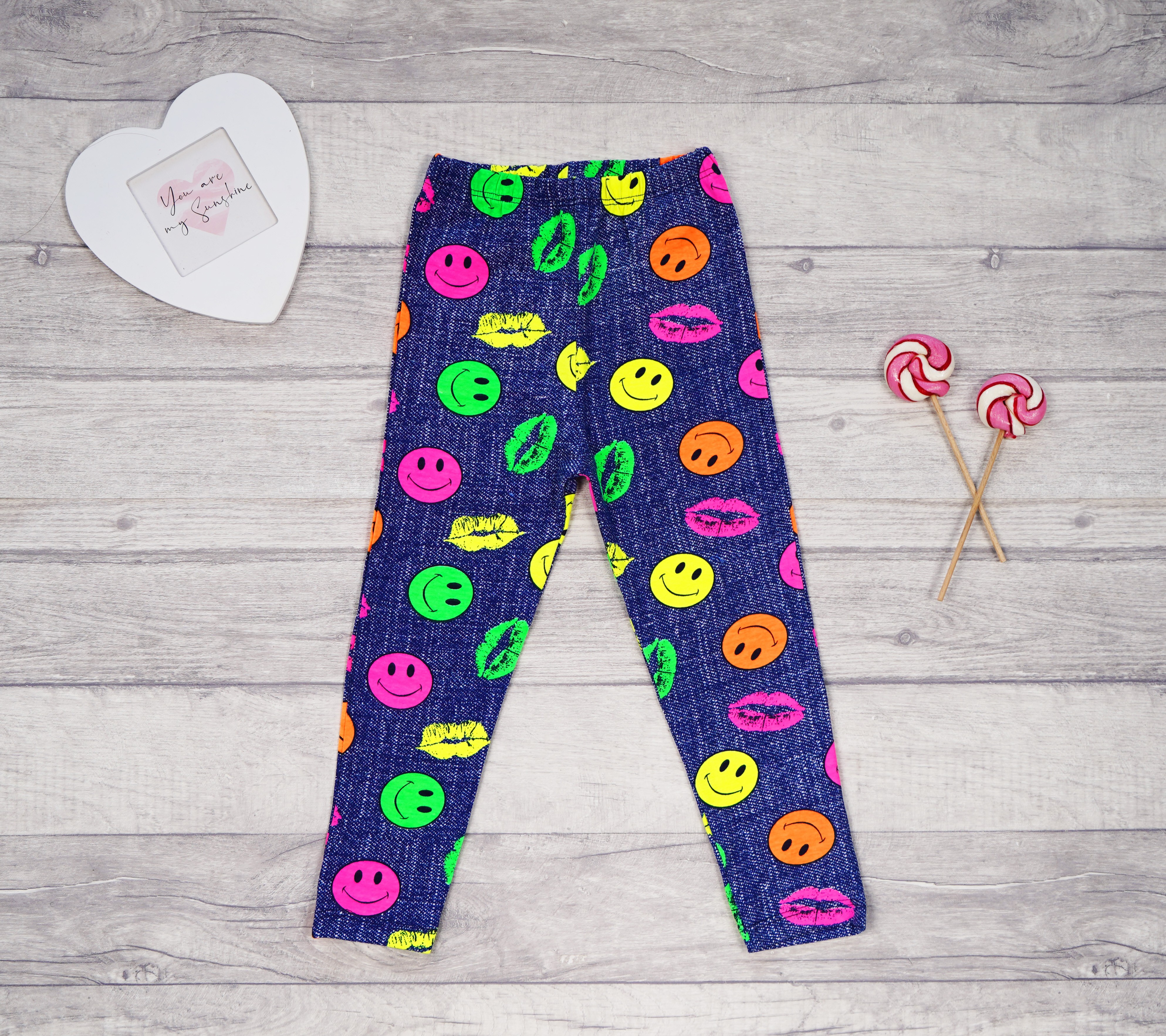 Dziewczęce legginsy z nadrukiem neonowych emotek i ust.