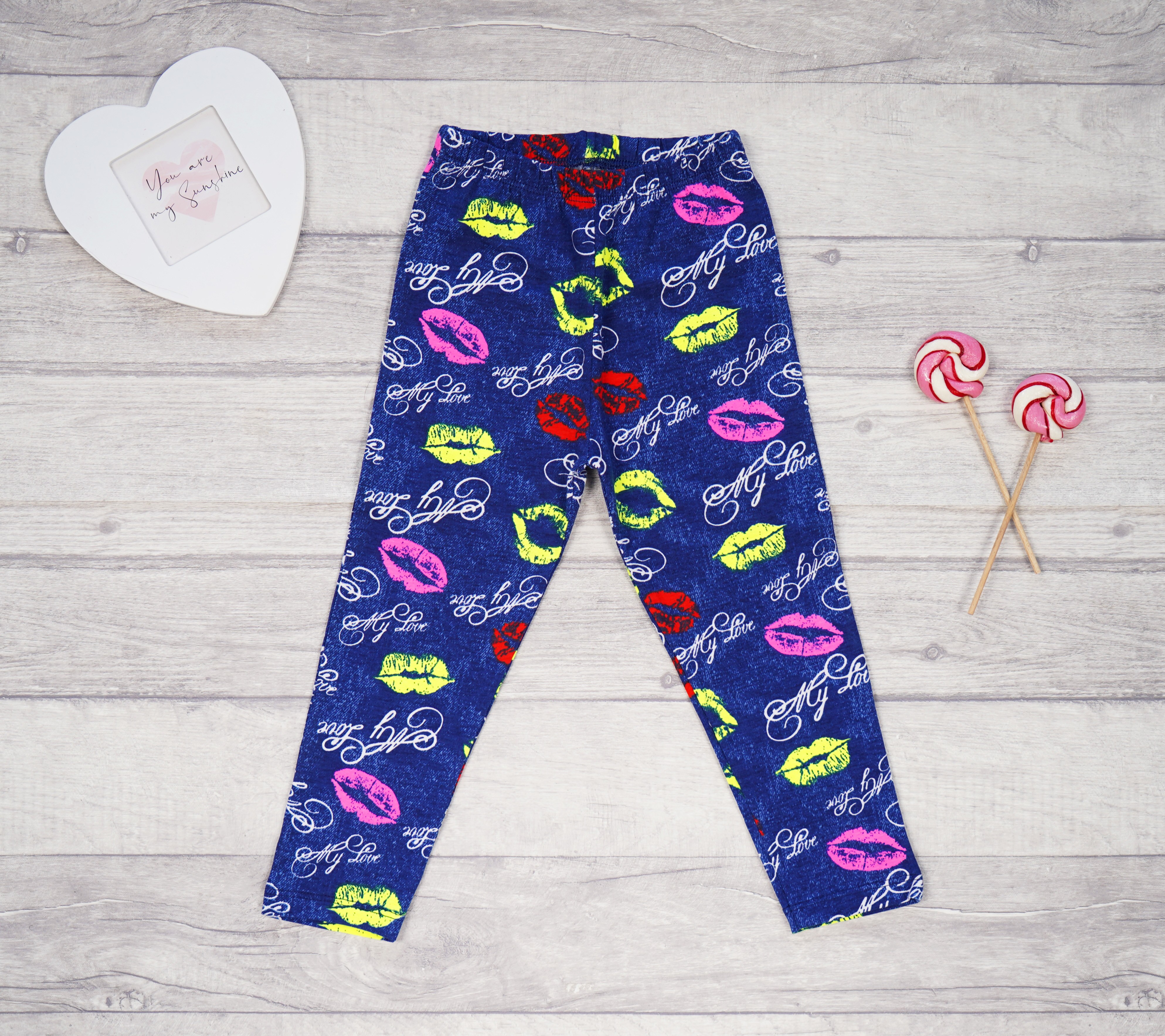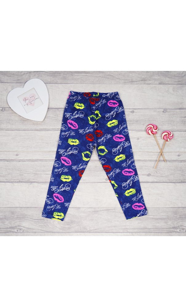 Dziewczęce legginsy z nadrukiem neonowych ust i napisami: My Love.
