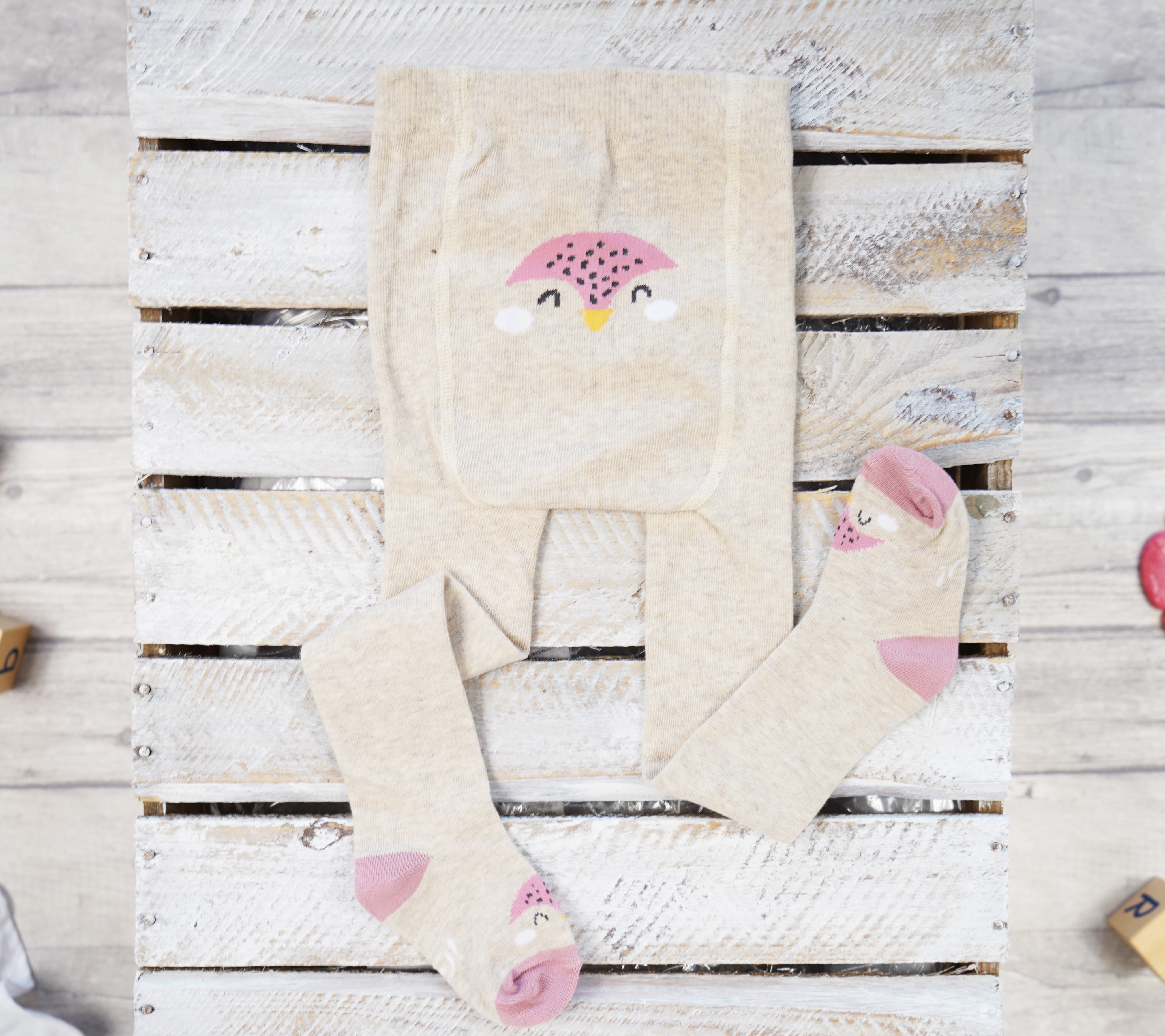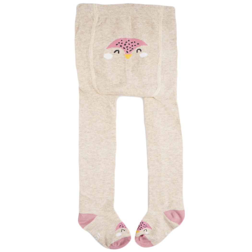 Beżowe rajstopki bawełniane dla dziewczynki z głową ptaszka.