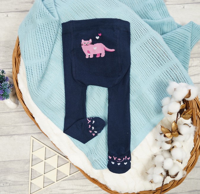 Granatowe rajstopki bawełniane dla dziecka kotkiem.