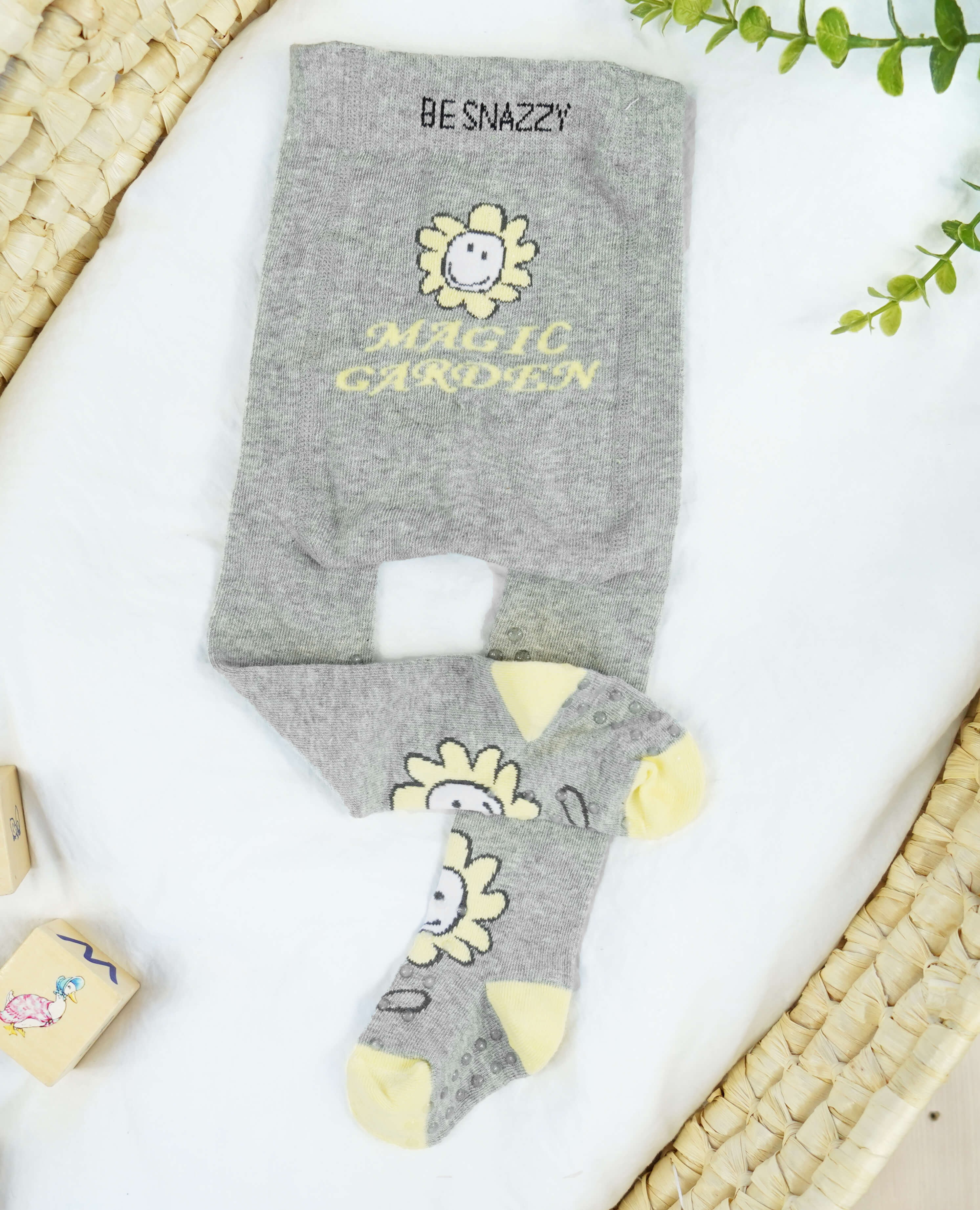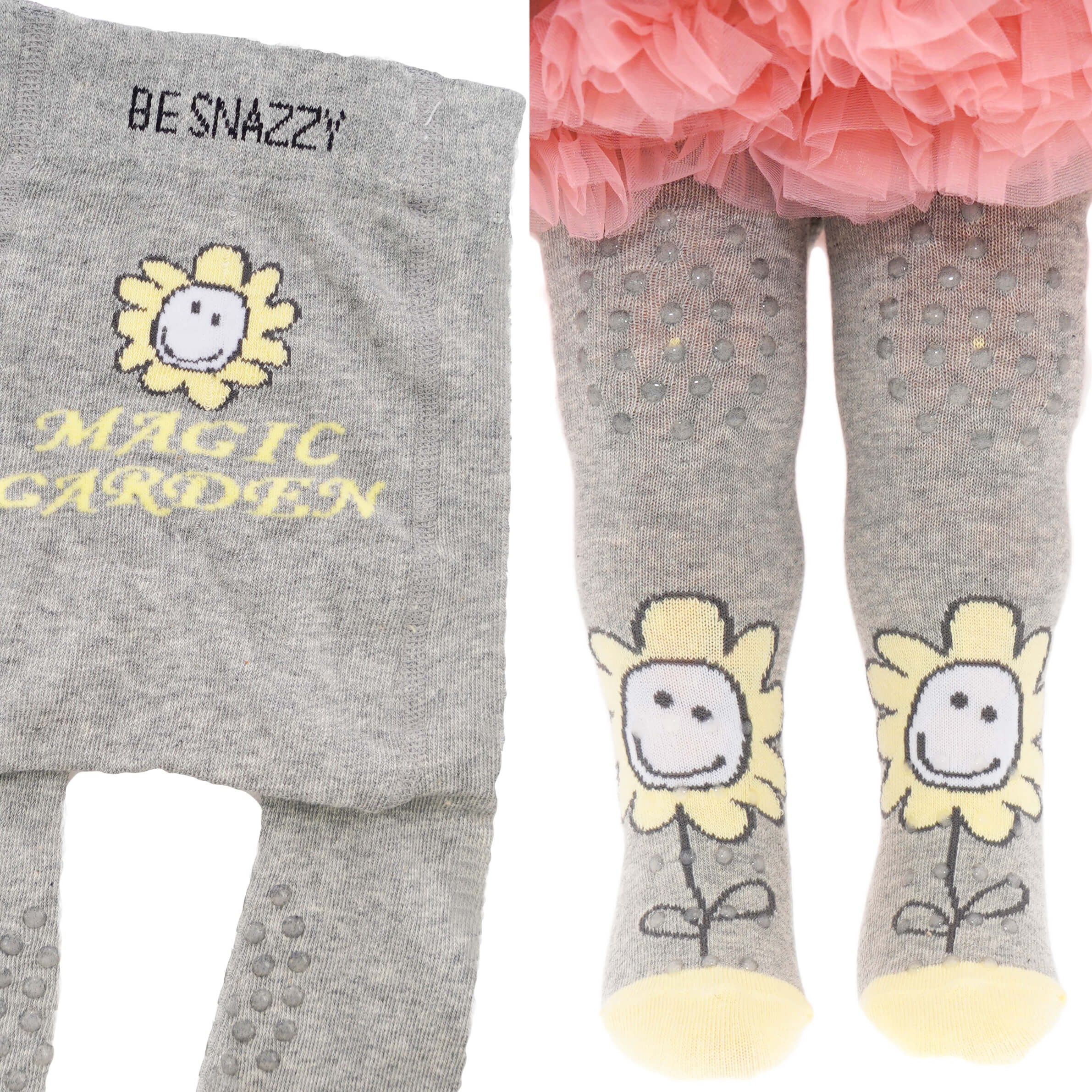 Szare rajstopki dla dziecka z żółtym kwiatkiem.