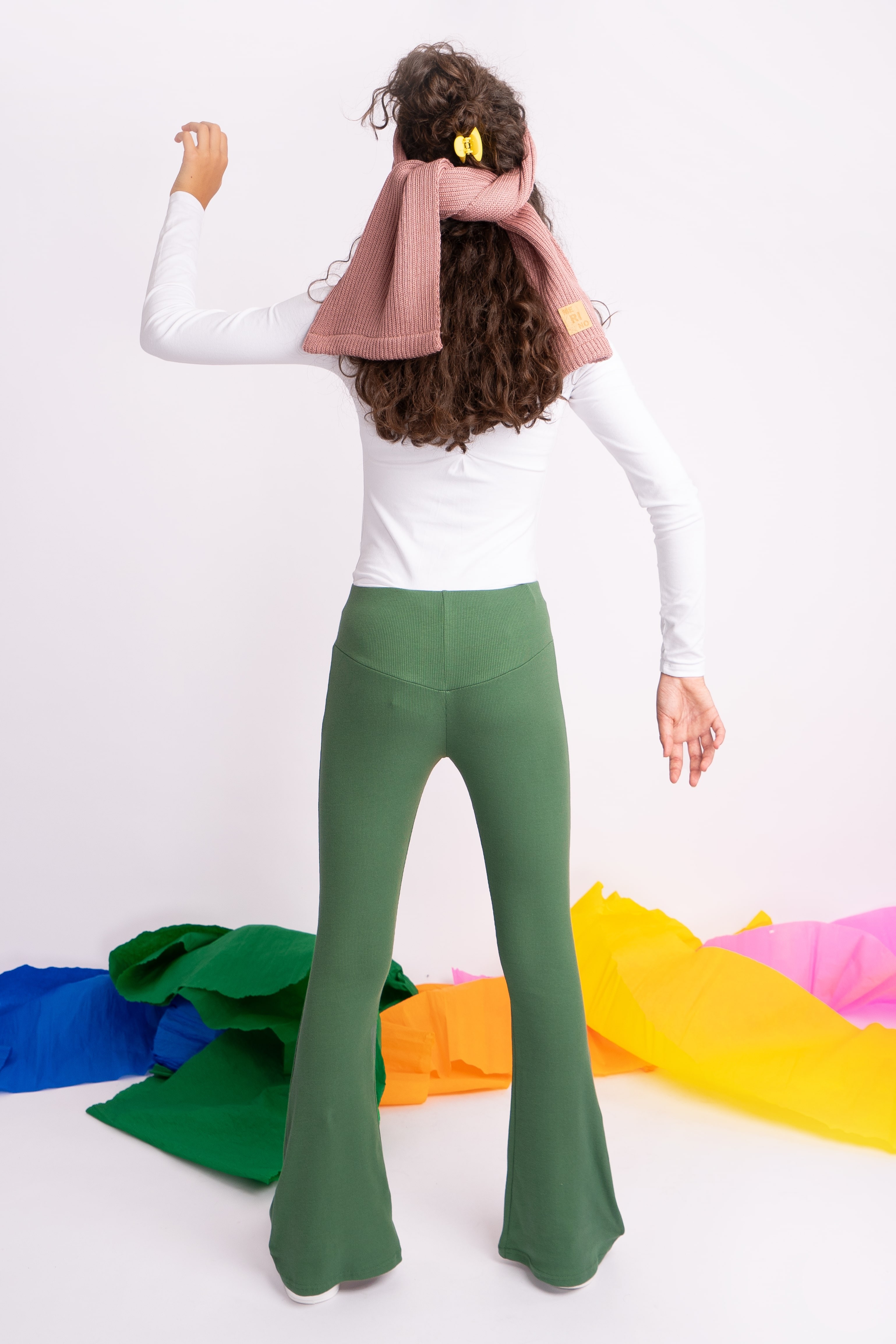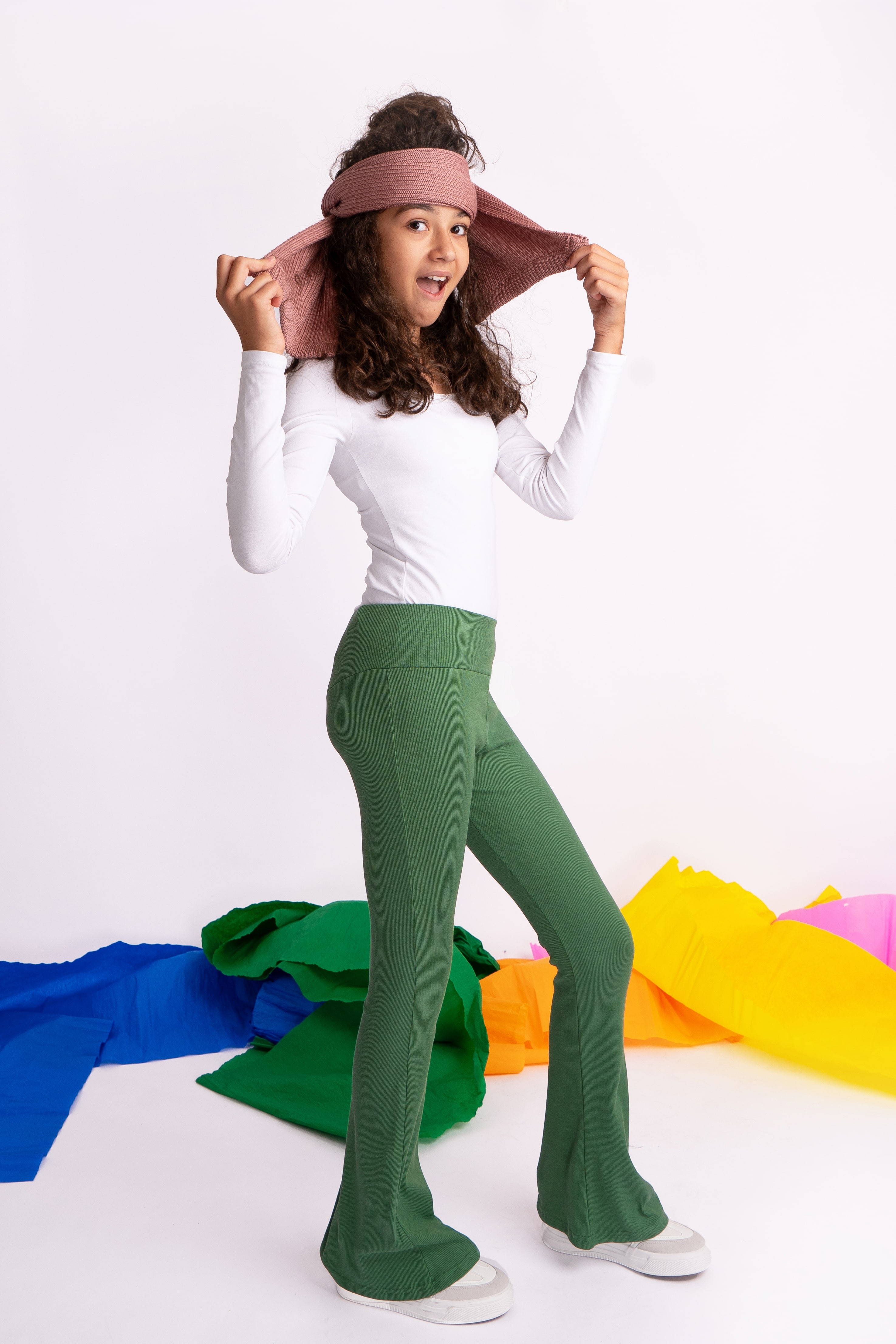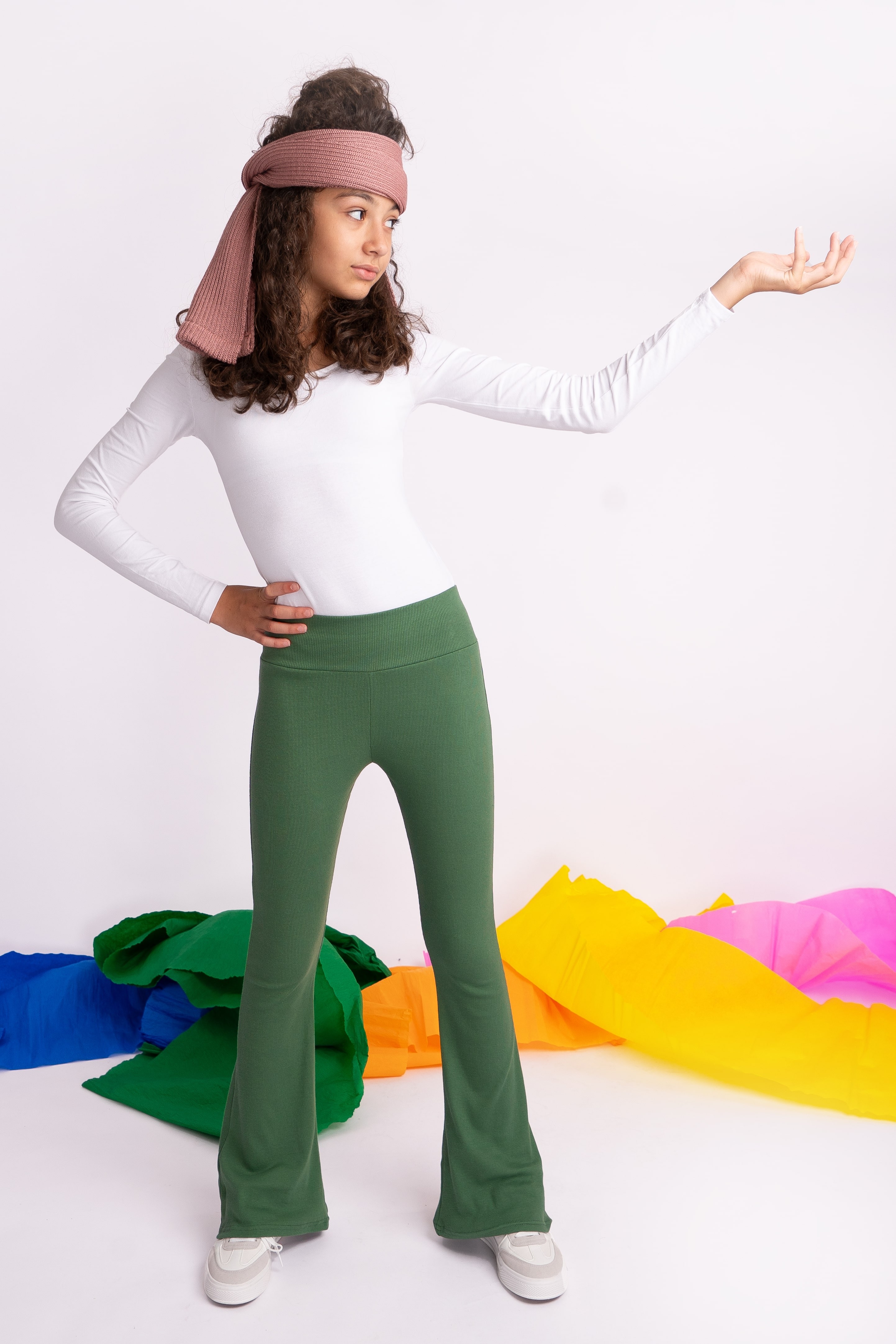 Khaki SPODNIE legginsy FLARE getry rozszerzane dzwony PRĄŻEK regulowane w pasie