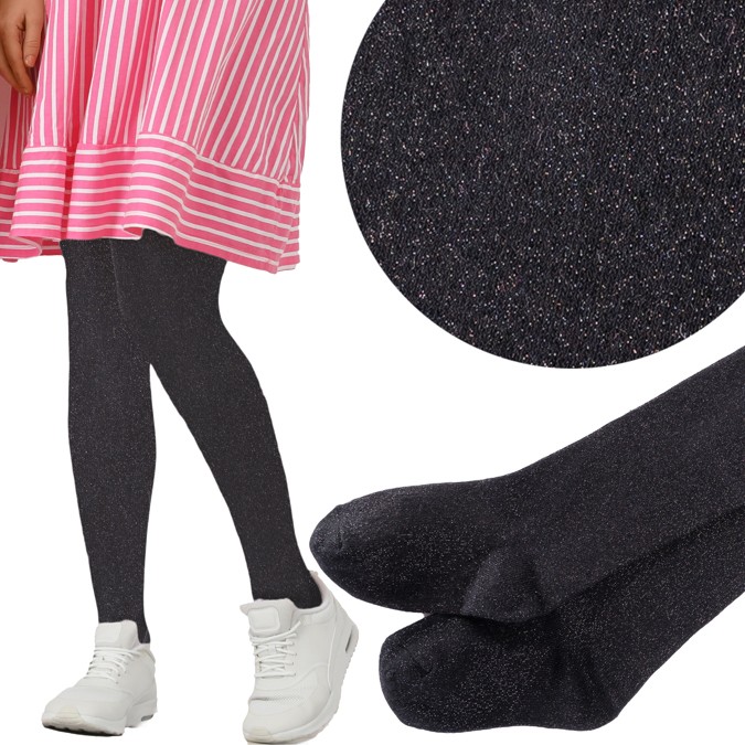 Czarne rajstopy bawełniane z czarną błyszczącą nitką dziewczęce brokatowe