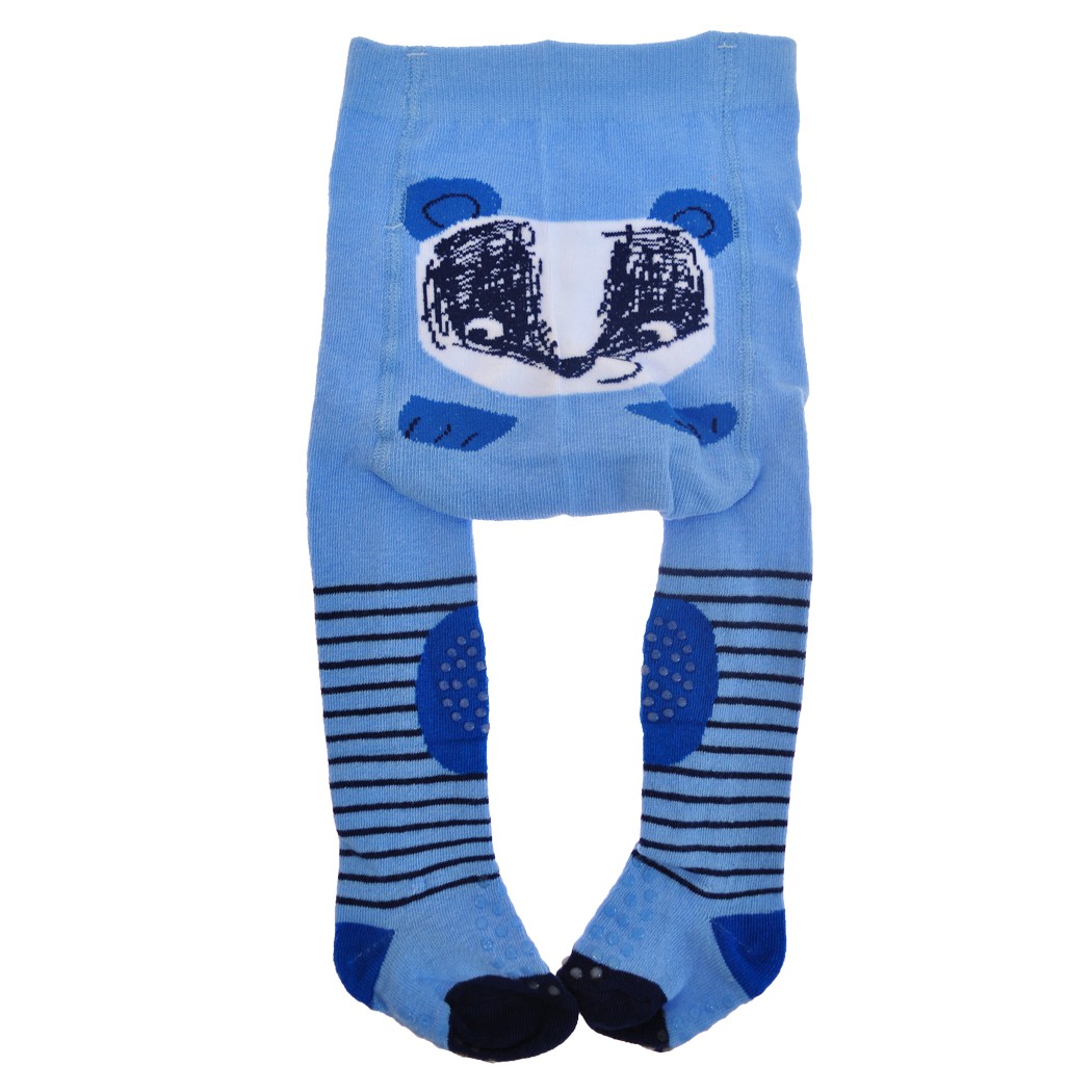Rajstopy w niebieskim kolorze rozjaśniają intensywne niebieskie akcenty. Całość prezentuje się stylowo i modnie dzięki paskom na nogawkach oraz umieszczony na pupie print przedstawiający szopa. Rajstopki dobrze dopasowują się do ciała i nie krępują ruchów, dzięki czemu Twoja pociecha może brykać do woli. Antypoślizgowe gumowe kropeczki ABS na stopach z przodu i od spodu jak również na kolankach zapewniają świetną przyczepność na każdej powierzchni oraz pozwolą bezpiecznie poznawać otoczenie, a maluszek nie pościera sobie kolan.