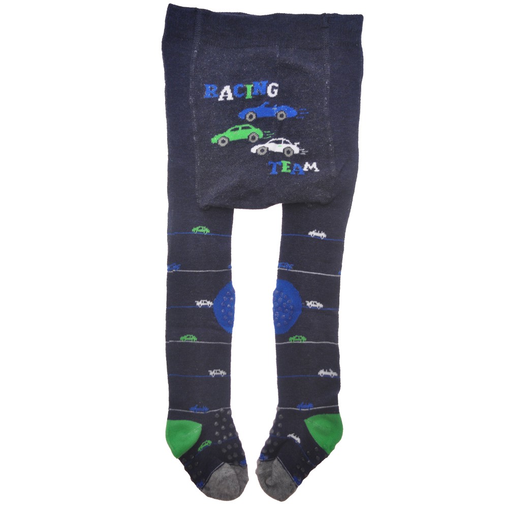 Rajstopy w granatowym kolorze rozjaśniają intensywne neonowe akcenty. Całość prezentuje się stylowo i modnie dzięki nadrukowi na nogawkach oraz umieszczony na pupie print przedstawiający autka. Rajstopki dobrze dopasowują się do ciała i nie krępują ruchów, dzięki czemu Twoja pociecha może brykać do woli. Antypoślizgowe gumowe kropeczki ABS na stopach z przodu i od spodu jak również na kolankach zapewniają świetną przyczepność na każdej powierzchni oraz pozwolą bezpiecznie poznawać otoczenie, a maluszek nie pościera sobie kolan.