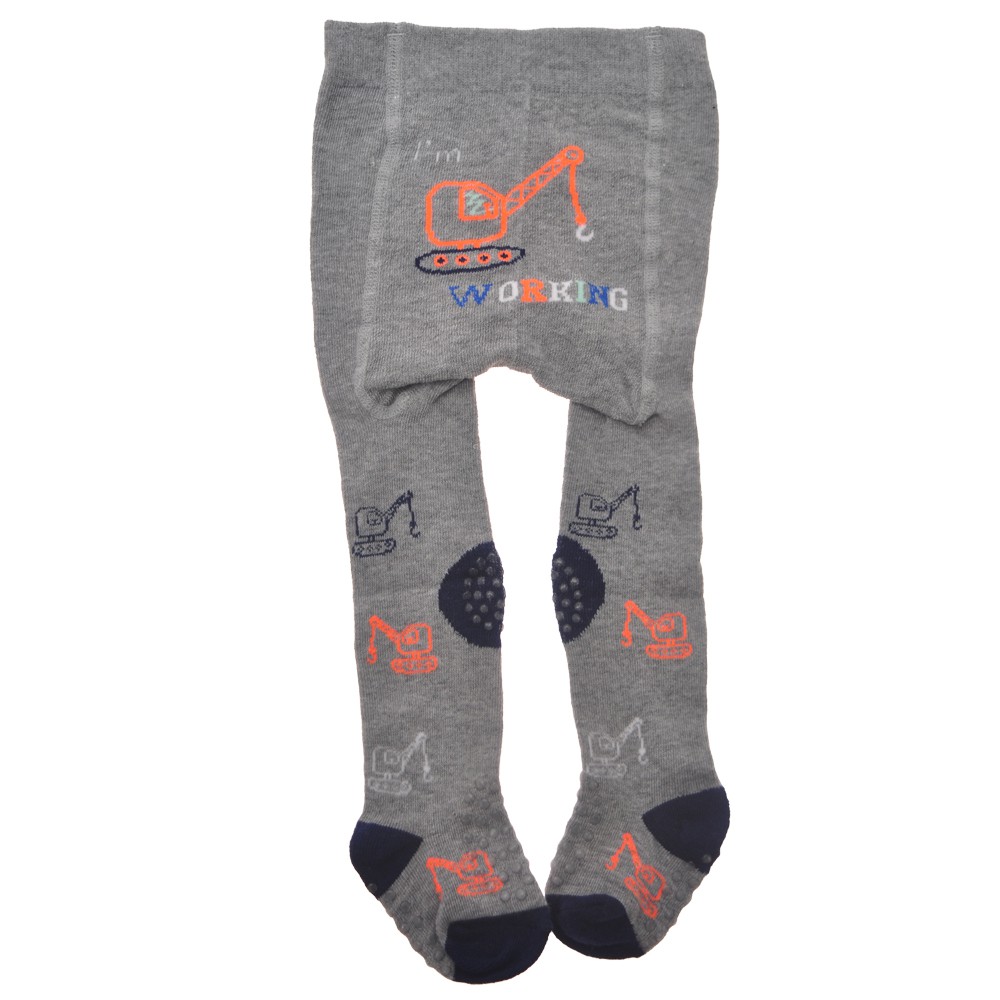 Rajstopy w szarym kolorze rozjaśniają intensywne pomarańczowe akcenty. Całość prezentuje się stylowo i modnie dzięki nadrukowi na nogawkach oraz umieszczony na pupie print przedstawiający dźwig. Rajstopki dobrze dopasowują się do ciała i nie krępują ruchów, dzięki czemu Twoja pociecha może brykać do woli. Antypoślizgowe gumowe kropeczki ABS na stopach z przodu i od spodu jak również na kolankach zapewniają świetną przyczepność na każdej powierzchni oraz pozwolą bezpiecznie poznawać otoczenie, a maluszek nie pościera sobie kolan.