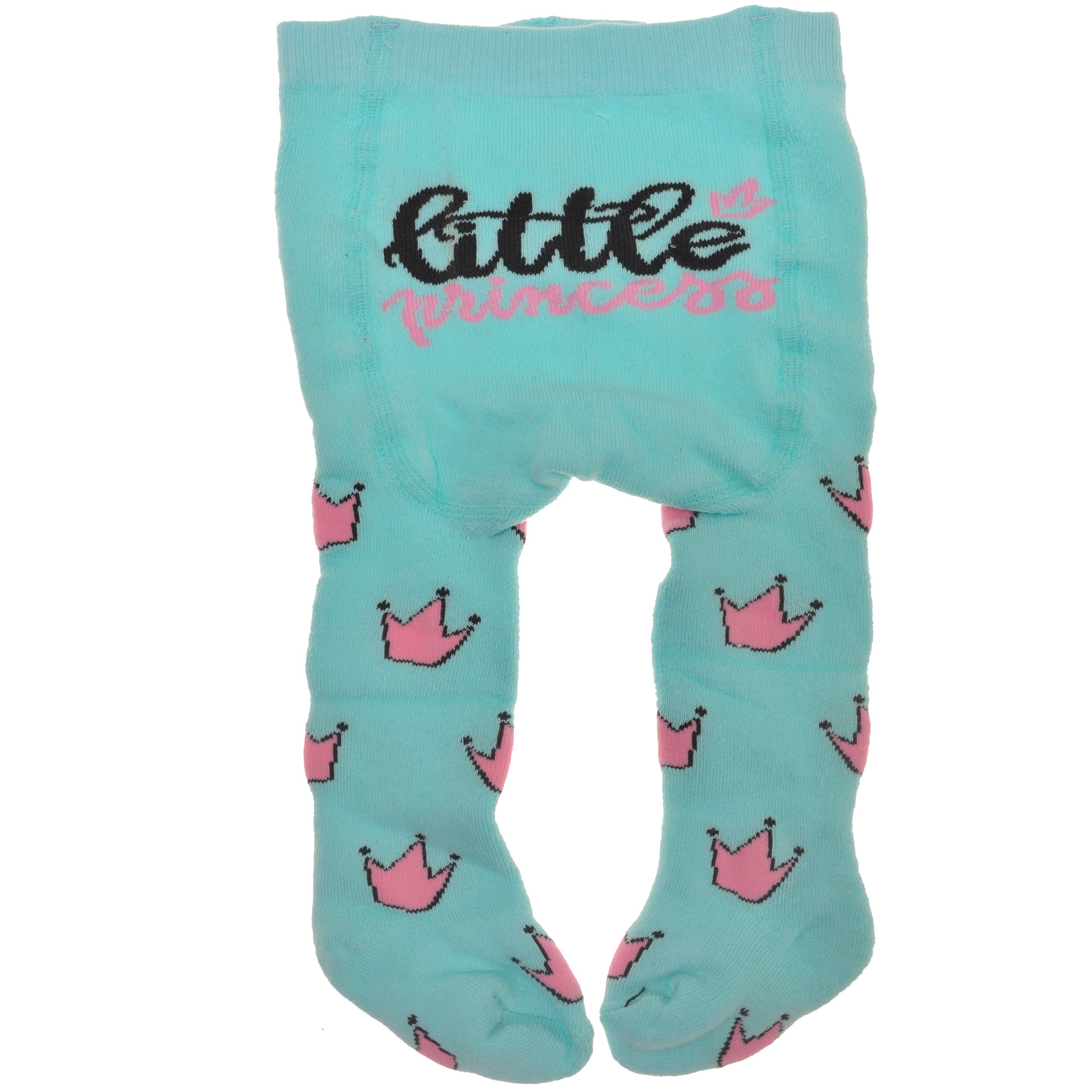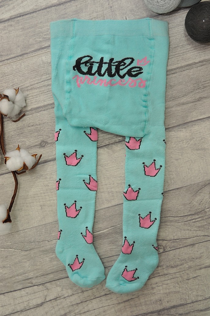 Miętowe rajstopki frotte dla dziewczynki z koronami i napisem "little princess"